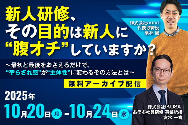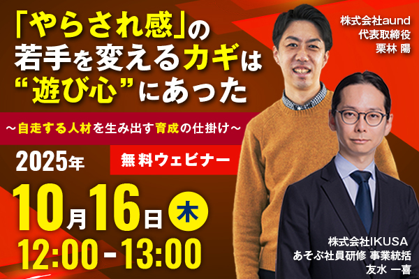 あそぶ社員研修とは あそびの力で学びを最大化させる あそぶ社員研修とは、あそびを通した実践的なアウトプットとそれに紐づく講義が一体化した研修です。 あそびで本気になることで座学やワークが自分事となり、受講者の態度変容を大きく促し、 翌日からの業務で実践できるようになります。 「ゲーム学習(Game-based learning)」と「アクティブラーニング(Active learning)」を組み合わせたIKUSA独自の研修です。 株式会社IKUSAは「あそびの価値を高める」ために、 様々な100種類以上のオリジナルサービスを開発しています。 累計10万人、満足度95%以上の体験型イベントを行っております。 あそぶ社員研修は従来の座学型や体験型とは違った「没入型」の研修です。 チームビルディングを行うことで、主体性が発揮され、参加者の学びが定着します。 よくあるお悩み このようなお悩みはありませんか? 研修に対する参加意欲が低い 座学は受け身になりがちで、研修効果に疑問がある 業務に活かせる研修を実施したい 新入社員に興味を持って、主体的に取り組んで欲しい 研修中に手厚くサポートして欲しい あそぶ社員研修なら、参加者が前のめりになって学習し翌日からの業務に役立ちます 体験型アクティビティと講義のセットで学習効果を最大限に 講義と連動したアクティビティ体験型の研修で、圧倒的に楽しく、学べる時間を創出。 受講者が前のめりになって参加するので学習定着率が高くなります。 モチベーションではなく、エンゲージメントを高める研修 あそぶ社員研修には受講者同士で実施する「チームビルディング」が組み込まれています。 素の自分を出し、全員で真剣に考え、共に壁を乗り越えることで、心理的安全性を高める設計となっています。 大手企業の採用費は1人当たり1800万円。※1 しかし、定着にかけている費用はたったの年間3万円。※2 人的資本経営の一助となる研修 ※1 出典:株式会社リクルート「就職白書2020」 ※2 出典:2022年度 教育研修費用の実態調査 | 教育研修費用の実態調査 | 採用・教育 | 産労総合研究所 講師+ファシリテータによる徹底的なフォローアップ あそぶ社員研修は没入型の研修。そのため、講師だけの開催ではなく、講師+ファシリテータ複数名のセットで研修を行います。そのため、講義中の細かい質問や参加者の様子の記録など細やかなフォローを行うことが可能です。 (例)100名実施のケース →講師1名+ファシリテータ5名 サービス 豊富な研修プランを揃えています コミュニケーション研修研修 社内や社外問わずビジネスコミュニケーションをとる方法、マインドを学びます ロジカルシンキング研修 業務の遂行に必要なロジカルシンキングを実践的に学ぶことができます PDCA研修 PDCAの基礎を学び、体感的に業務改善の仕組みを学ぶことができます ビジネスマナー研修 新人に必要不可欠なビジネスマナーを実際に体験しながら、学ぶことができます クリティカルシンキング研修 ビジネスに必要な論理展開や仮説思考を学ぶことができます 合意形成・アサーティブコミュニケーション研修 立場や価値観が異なる相手と合意形成していくための方法を学びます 交渉術・ネゴシエーション研修 ビジネスシーンにおける交渉を疑似体験しながら、「交渉術」を学ぶことができます 戦略思考 会社経営の疑似体験を通じて、戦略思考を学ぶことができます リーダーシップ研修 現代にあわせたリーダーシップの発揮の必要性を知り、自分らしいリーダーシップについて学びます OODA LOOP研修 OODA LOOPの基礎を学び、体感的に業務改善の仕組みを習得できます 防災研修 災害の基礎知識、リスクアセスメントやBCP(事業継続計画)について学びます SDGs研修 SDGsの基本的な考えを学び、企業の取り組みと紐づけ考え、社員の主体的な意識醸成をします 資料をダウンロードする 導入事例 業界を問わずご利用いただいています 年間実施件数1000件以上 フロー あそぶ社員研修の流れ あそぶアクティビティを通して、能動的に自分の行動やグループの行動に気づきを得て、そこから座学、グループワークを行います。 あそぶアクティビティ1.5時間〜3時間 チームを組んで、研修テーマに沿った体験型のアクティビティを行います。 座学・グループワーク1.5時間〜6時間 アクティビティを踏まえ、座学でのインプットを経て、つづいて実践的なグループワークを行います。 グループ発表0.5時間〜 グループワークに基づいて、各チームの発表を行います。 フィードバック・振返り0.5時間 講師や別チームからのフィードバックを受けて、最後に自身の振返りを行います。 当日までの流れ 1 日程の確定 研修実施枠の確保 2 プログラム内容お打合せ 当日行う講義内容のお打合せを行います 3 人数、チーム数決定 人数を決めたらチーム分けを行います(1チーム/4〜6人) 4 本番当日 運営はIKUSAスタッフが全て行います セミナー・体験会 ~令和流・人が辞めない職場を作る~採用・育成・定着のトータル人材戦略 日程 2025.1