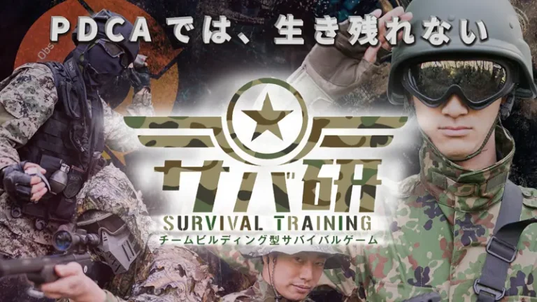 サバ研は、最速で意思決定ができる思考法であるOODA LOOP、臨機応変に対応できる組織作り、現代のリーダー像などをサバイバルゲームを通じて学べるアクティビティです。OODA LOOPとはアメリカの軍事戦略家であるジョン・ボイド⽒が提唱した意思決定⽅法です。本格的なエアガンに限らず、レーザー銃を使⽤してより安全に実施することもできます。サバイバルゲームの実践の前に講習を⾏い、実施中はブリーフィングを挟むため、学習と実践を通じて具体的に学べることが特徴です。