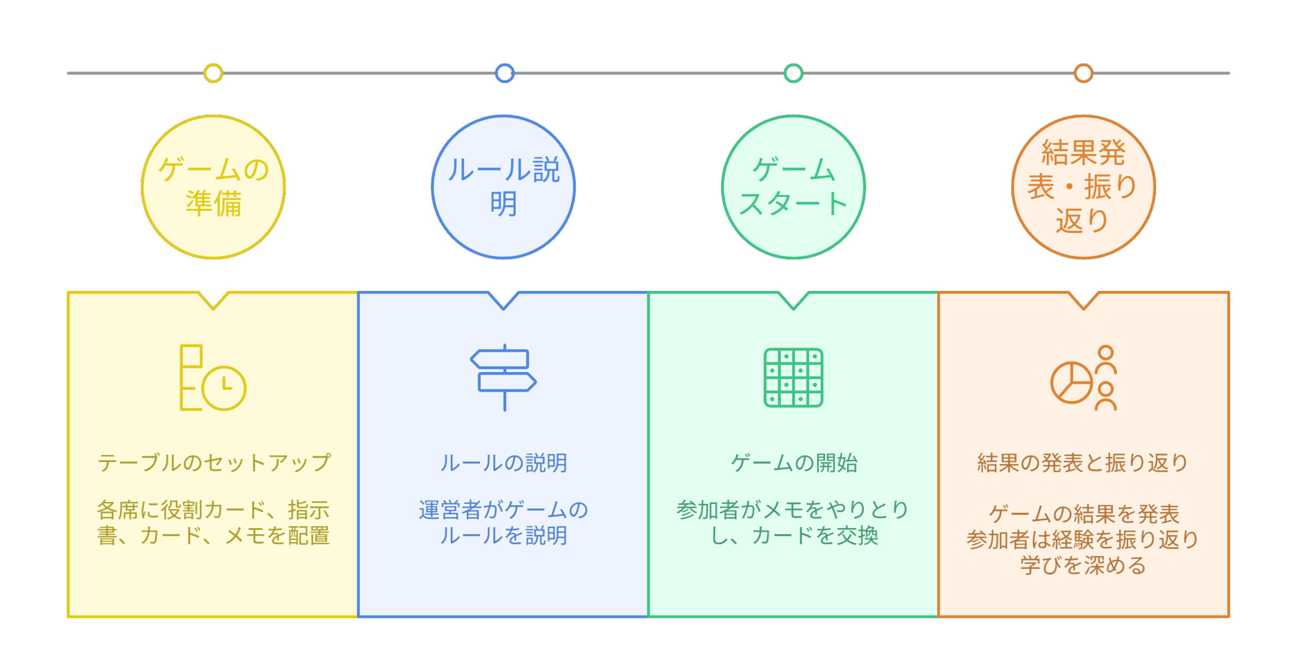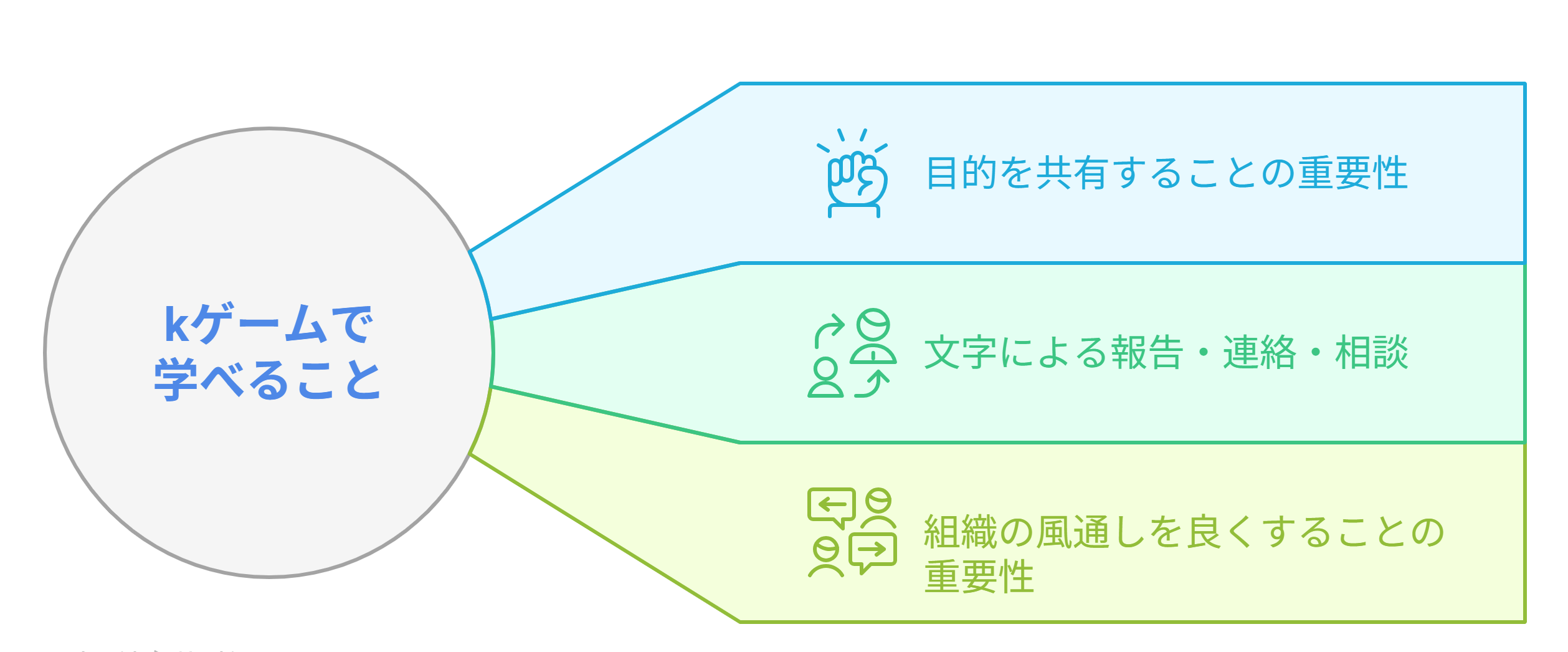 あそぶ社員研修 > お役立ち情報 > 研修ノウハウ > kゲームとは?学べること、実施するときの注意点を紹介 kゲームとは?学べること、実施するときの注意点を紹介 2025.11.11 研修ノウハウ この記事の監修者 友水 一喜 株式会社IKUSA あそぶ社員研修事業部 責任者 研修は、座って講義を聞くだけよりも、参加者自身が何かを「体験して学べる」プログラムがあったほうが、知識やスキルが身につきやすくなるといわれています。そのため、最近はビジネスゲームを取り入れた研修も増えています。本記事では、企業の研修におすすめの「kゲーム」というビジネスゲームを紹介します。kゲームとはどのようなゲームなのか、やり方、ゲームを通して学べること、研修などで実施するときの注意点を、詳しく見ていきましょう。 研修ゲームで楽しく自分事化し、プロ講師によるワークで実務と結びつける 「あそぶ社員研修 総合資料」を無料で受け取る 目次kゲームとはkゲームのやり方kゲームで学べること研修などでkゲームを実施するときの注意点まとめkゲームとはkゲームとは、ビジネスの基本である報連相(報告・連絡・相談)や、コミュニケーションのとり方、メンバー同士で目的や目標を共有することの重要性などを学べるビジネスゲームです。このゲームでは、ゲーム中は会話をしてはいけません。メモのやり取りだけで、メンバー全員で目的の達成を目指すというゲームです。部課長ゲーム、報連相ゲーム、指示書達成ゲームなどと呼ばれることもあります。このゲームには5つの役割があるため、基本的には1グループ5人で実施します(4人でも実施可能です)。「部課長ゲーム」「報連相パズル」における役割は、以下の通りです。「部課長ゲーム」:部長、課長A、課長B、社員A、社員B「報連相パズル」:マネジャー、リーダーA、リーダーB、メンバーA、メンバーBでは、kゲームとはどのようなゲームなのか、次項よりやり方を詳しく見ていきます。 楽しさだけで終わらない。楽しいから自発的に参加でき、協働体験が従業員同士の繋がりを強める。感情と学びを結びつけエンゲージメントが向上する研修。「あそぶ社員研修 資料」を無料で受け取る kゲームのやり方kゲームを実施するには、専用のキットを用意する必要があります。手間なく実施したい場合は、キットをレンタルしてくれる研修会社に依頼するとよいでしょう。キットを用意できたら、まずグループ分けを行います。先ほどお伝えしたように、このゲームには5つの役割があります。5人ずつのグループに分けることができれば、何人でも実施可能です。きれいに5人ずつに分けることができない場合は、4人のグループができても構いません。役割はゲームを提供する会社によって名称が異なりますが、たとえばマネジャー、リーダーA、リーダーB、メンバーA、メンバーBの5種類の場合、1グループ4人で実施するときは、メンバーBをなしとします。グループ分けができたら、ゲームの準備から始めていきます。ゲームの準備kゲームは、1グループで1つのテーブルを使います。まず運営者は、各席に裏返した「役割カード」と「指示書」、4枚の「カード」、「メモ30枚」を配置しておきましょう。「カード」は5種類、合計20枚ありますので、これをランダムに4枚ずつ配置します。必要なものを各席に配置したら、参加者に着席してもらいます。座る席は参加者に選んでもらっても構いませんし、現実とは違う役割になるように運営者が席を指定してもよいでしょう。たとえば、実際に「マネジャー」のポジションに就いている人には「メンバー」の席に、グループのなかで一番若手の社員には「リーダー」の席に着いてもらうといった具合です。指示書とカードは、自分以外の人に見せてはいけないルールになっていますので、そのことを参加者に伝えておきましょう。ゲームのルール準備ができたら、参加者にルールを説明します。お伝えしたように、このゲームは会話禁止のゲームとなっています。ルール説明を始めたときから、グループ内の会話を禁止としましょう。参加者に説明する主なルールは、以下の通りです。今からゲーム終了まで口頭でコミュニケーションをとるのは禁止とし、メモのやり取りのみとすること。コミュニケーションをとることができる相手は限られていること。指示書に従い、参加者全員で協力して目的の達成を目指すこと。ゲーム中、コミュニケーションをとることができる相手を図にまとめると、以下のようになります。コミュニケーションをとることができる相手やゲームのルールは、参加者に配布される指示書にも記載されています。ゲームスタートルール説明が終わったら、いよいよゲームスタートです。ゲームの制限時間は25分。参加者はお互いにメモのやり取りをして、カードを交換します。カードを交換できるのも、前項で示した図で実線の矢印でつながっている相手のみというルールになっています。カードは、必ず同じ枚数を交