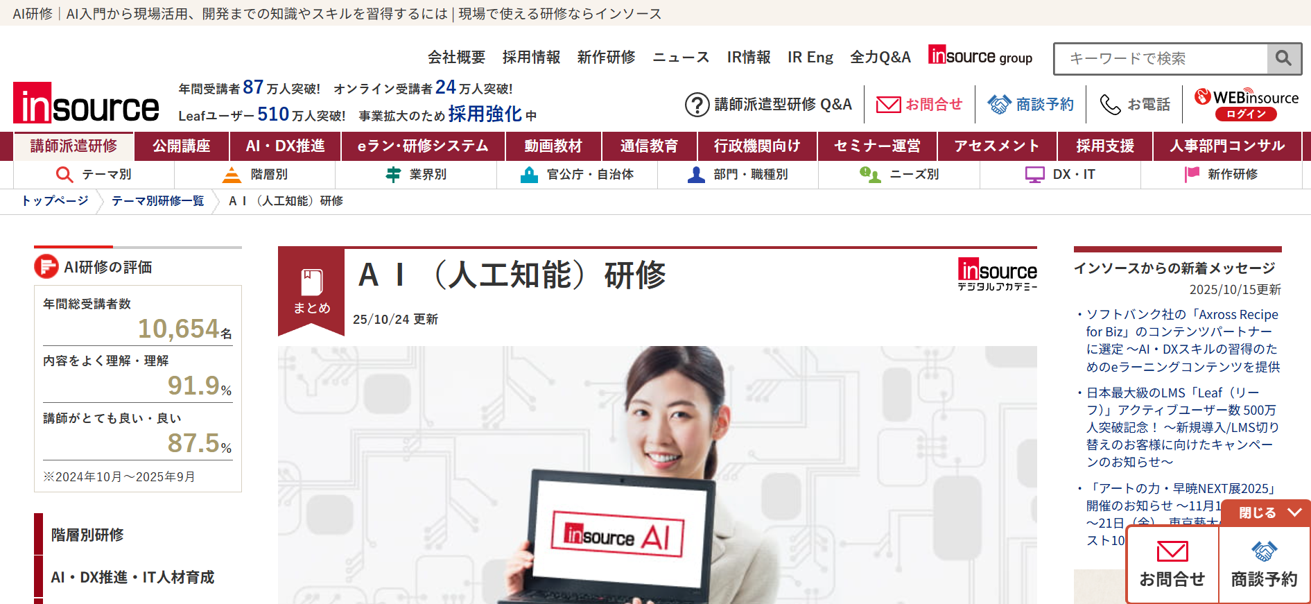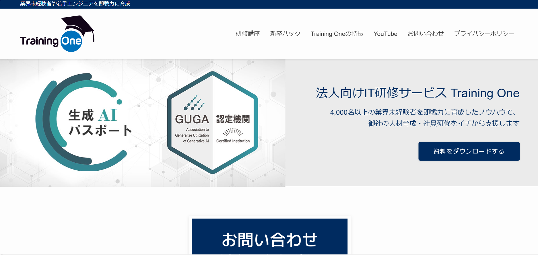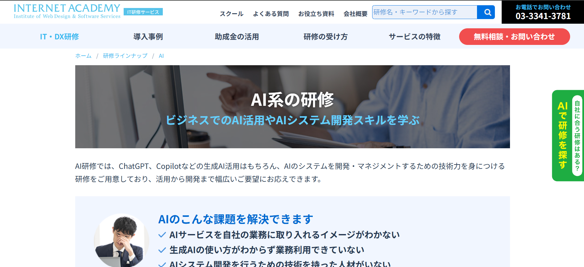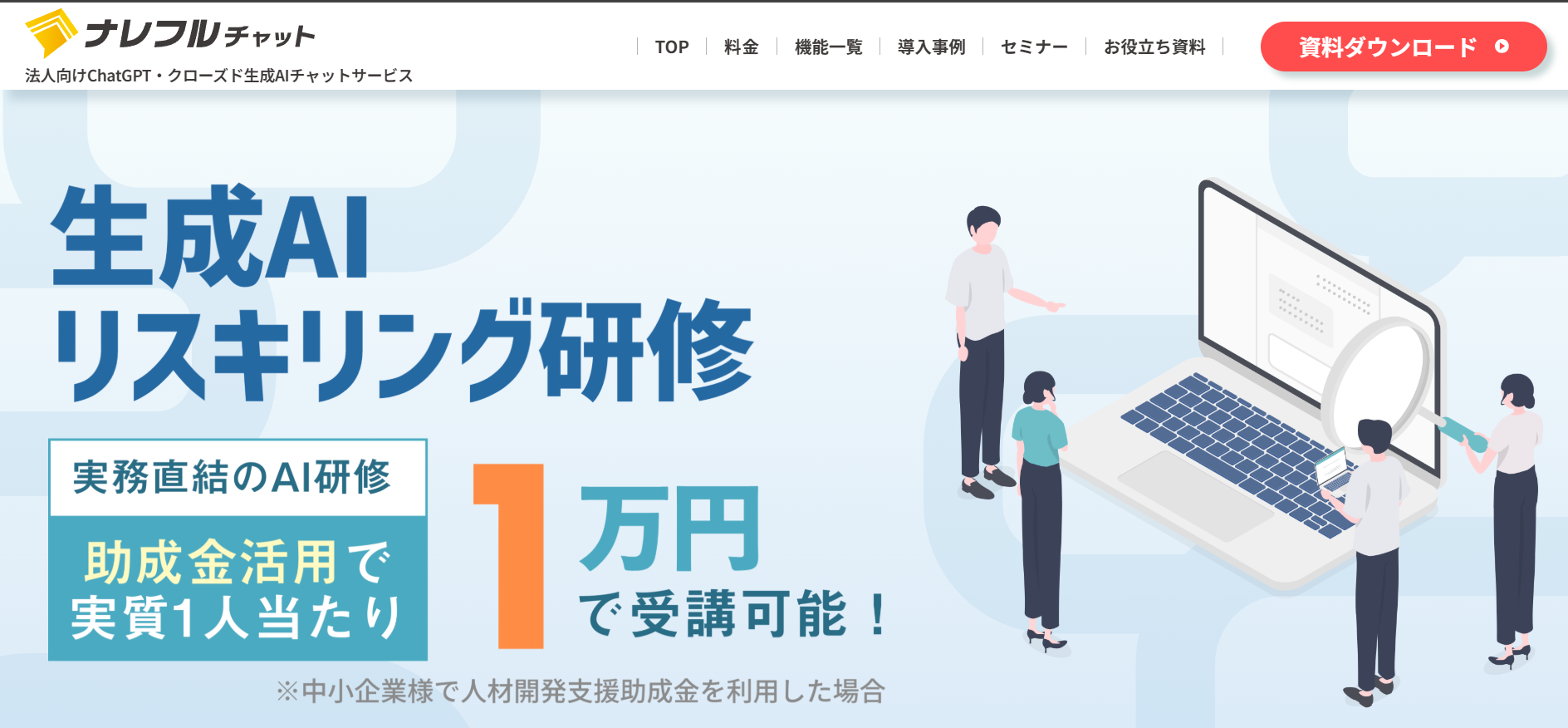 あそぶ社員研修 > お役立ち情報 > ビジネススキル > AI研修サービスのおすすめ20選を紹介!各社の特徴やサービス内容を解説 AI研修サービスのおすすめ20選を紹介!各社の特徴やサービス内容を解説 2026.02.03 ビジネススキル組織・人材開発 研修社会人基礎力 年々、急速に進化するAI。時代のスピードについていくため、企業においてもAIを活用する知識やスキルを有する人材を確保することの重要性が高まってきています。本記事では、「自社でもそろそろAI人材の育成に取り組んでいきたい」と考えている研修担当者様に向けて、おすすめのAI研修サービス20選をご紹介いたします。※本記事に記載の情報は2025年11時点のものです。各研修サービスの最新情報は公式サイトにてご確認ください。 研修ゲームで楽しく自分事化し、プロ講師によるワークで実務と結びつける 「あそぶ社員研修 総合資料」を無料で受け取る 目次AI研修サービスのおすすめ20選まとめAI研修サービスのおすすめ20選では早速、おすすめのAI研修サービス20選を紹介していきます。1.トレノケート株式会社トレノケート株式会社は、IT技術教育やビジネススキル教育など、人材育成に関するソリューションを提供している会社です。公式サイトによると、年間約1,600社との取引実績があり、1,600以上の多彩な研修コースを展開しています(2025年5月現在)。AI関連では、AIの基礎から学べる研修や、生成AIの活用に向けた研修、AIの活用法を企画・立案する力をつける研修、さらにはAIの開発・運用力を身につける研修まで、幅広く用意されています。集合研修に加えてeラーニングも提供しているため、業務の合間に手軽にAIを学びたい方にもおすすめの研修サービスです。公式サイト:人材育成の専門企業トレノケート|IT研修、ビジネス研修、資格対策2.株式会社インソース株式会社インソースは、講師派遣型研修や公開講座、eラーニングなどの教育サービスを提供している会社です。組織がAIをうまく活用していくためには、特定の人材だけでなくさまざまな階層・部門の人材がAIに関する知識を持つことが重要です。そのため株式会社インソースでは、階層別や部門別に幅広いAI研修を用意しており、習熟度に応じて最適な研修を提案してくれます。半日で終わるプランもあれば、2週間かけてDX人材を育成するコースもあります。研修ラインナップが豊富であるため、目的に合う研修をきっと見つけられるでしょう。公式サイト:株式会社インソース|社員研修・ITによる生産性向上支援3.DMM 生成AI CAMP「DMM 生成AI CAMP」は、DMM.com グループの株式会社インフラトップが運営するオンラインスクールです。短期間で、生成AIに関する知識を身につけることができます。生成AIをビジネスでうまく活用するために必要なスキルは、大きく2つあります。1つは、AIに適切な指示や質問を与えるためのプロンプトエンジニアリング、もう1つは、生成AIを活用したアプリを開発するスキルです。「DMM 生成AI CAMP」では、プロンプトエンジニアリングを学べるコースが4つ、生成AIアプリ開発を学べるコースが2つ用意されており、受講者のレベルや目的に応じて最適なコースを選択できます。公式サイト:【公式】DMM 生成AI CAMP|生成AIスクール|ChatGPTなど生成AIが学べるオンラインスクール・講座4. Algomatic AI Academy「Algomatic AI Academy」は、株式会社Algomaticが提供する、生成AI人材育成のための実務直結型プログラムです。研修は、全社員向けの生成AIリテラシー研修、生成AIセキュリティ研修のほか、経営層向け研修、リーダーやメンバー向けのAIツール活用研修、AIエージェント研修など、多様なテーマが用意されています。また「Algomatic AI Academy」の研修は、現場でAIの活用を推進・指導できる人材を育成するプログラムとなっており、専任のメンターが研修後の成果報告会までサポートしてくれます。研修で学んで終わりではないというのも、「Algomatic AI Academy」の特徴です。公式サイト:業務変革を加速する生成AI人材育成プログラム|Algomatic AI Academy5.株式会社リスキル株式会社リスキルは、ビジネスに必要なさまざまな知識・スキルを学べる研修を提供している会社です。取り扱う研修の種類は、なんと837種類もあります。どの研修も、受講人数やカスタマイズの有無にかかわらず、料金一律で実施してもらうことができます。生成AIに関する研修も多数用意されています。AIの基本を学ぶ研修や、ChatGPT、Microsoft Copilot、Copilot in Wordなどといった、AIの種類やツール別に活用法を学ぶ研修もあります。研修時間はテーマによって異なりますが、3~6時間と気軽に参加しやすい時間に設定されています。生成AIの活用だけでなく、DXを推進するためのデジタル人材育成研修も豊富です。公式サイト:社員研修のリスキル Reskill | すべての研修が『料金一律』6.ナレフルチャット「ナレフルチャット」は、CLINKS(クリンクス)株式会社が提供する法人向けの対話型生成AIチャットツールです。クローズドな環境で利用できるため
