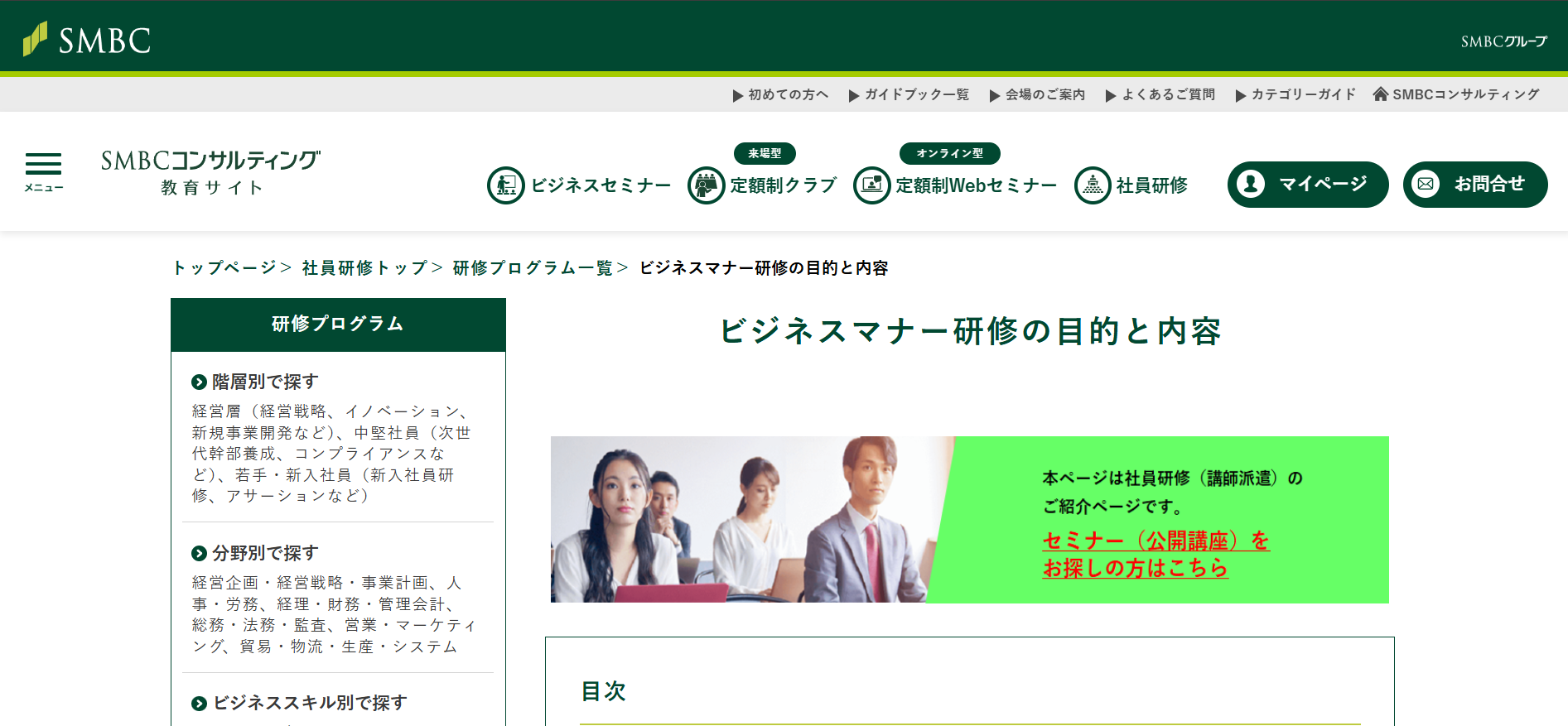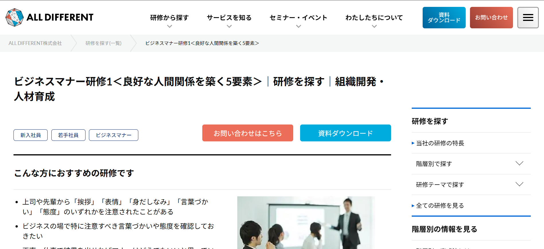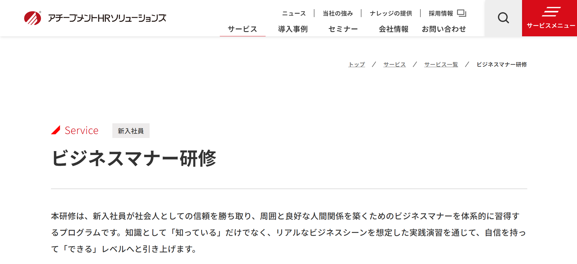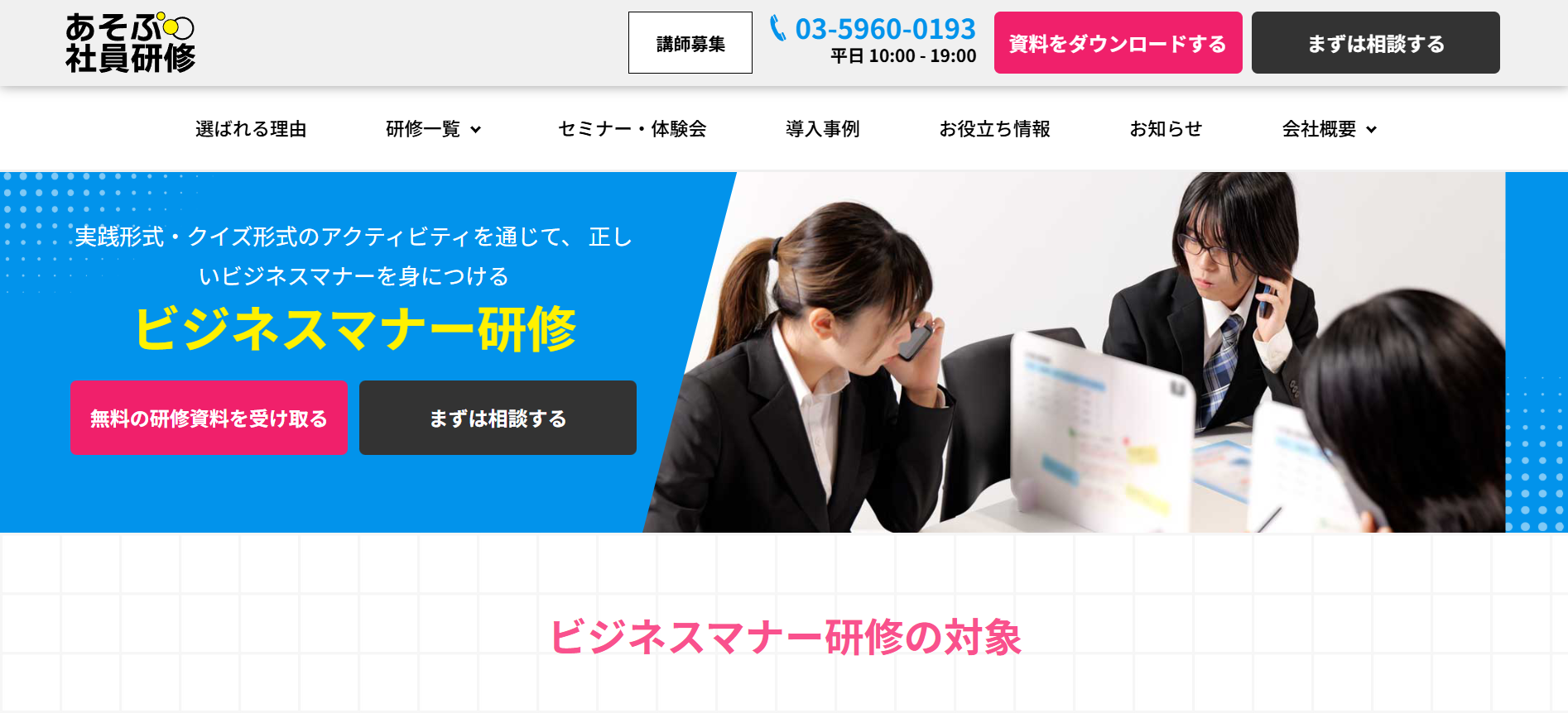 あそぶ社員研修 > お役立ち情報 > 研修ノウハウ > ビジネスマナー研修サービスのおすすめ20選を紹介!特徴・内容を解説 ビジネスマナー研修サービスのおすすめ20選を紹介!特徴・内容を解説 2026.02.03 研修ノウハウ 研修ビジネスマナー 新入社員や内定者に対して、毎年ビジネスマナー研修を実施している会社は多いです。また、さらなるスキルアップのために、若手社員やリーダーを対象に改めてビジネスマナー研修を実施するケースもあります。本記事では、ビジネスマナー研修の実施を検討されている方に向けて、おすすめのビジネスマナー研修サービス20選を紹介します。※本記事に記載の情報は2025年11月時点のものです。各研修サービスの最新情報は公式サイトにてご確認ください。 研修ゲームで楽しく自分事化し、プロ講師によるワークで実務と結びつける 「あそぶ社員研修 総合資料」を無料で受け取る 目次ビジネスマナー研修サービスのおすすめ20選!まとめビジネスマナー研修サービスのおすすめ20選!では早速、ビジネスマナー研修サービスのおすすめ20選を紹介していきます。1.あそぶ社員研修株式会社IKUSAが提供する研修サービス「あそぶ社員研修」には、多くのプログラムで、テーマに関連したアクティビティが取り入れられています。ビジネスマナー研修で実施するのは、「ビジトレ」というアクティビティです。簡単なゲームやクイズを通してビジネスマナーを体験して学んだ後で、ビジネスマナーに関する講義・ワークを行います。研修のなかに「体験」と「楽しさ」をプラスすることで、受講者の主体性や集中力が高まります。テーマについての理解が深まり、翌日から現場で実践できるようになるでしょう。公式サイト:あそぶ社員研修 | ゲーム形式で学習意欲を高めるIKUSAの研修2.株式会社インソース株式会社インソースは、企業の経営課題の解決を幅広くサポートしている会社です。さまざまなテーマの研修サービスも提供しており、公式サイトによると年間の受講者数は87万人以上となっています。株式会社インソースの研修サービスは、講師派遣型研修と公開講座の2種類があります。プログラムの数も豊富で、ビジネスマナー研修1つを取っても、新入社員向けのものだけでなく、全従業員を対象とした研修や、CS(顧客満足度)の向上を目的とした研修、オンラインで受講可能な研修など、目的や受講形態に応じた多様なプログラムが用意されています。公式サイト:株式会社インソース|社員研修・ITによる生産性向上支援3.アチーブメントHRソリューションズ株式会社アチーブメントHRソリューションズ株式会社は、研修サービスの提供や組織開発コンサルティングを行っている会社です。アチーブメントHRソリューションズ株式会社の研修サービスは、知識やスキルだけでなく、マインドセットにもアプローチするよう設計されています。新入社員を対象としたビジネスマナー研修は、2日間の研修プログラムとなっています。1日目は社会人としての心構えや基本動作を、2日目はビジネスシミュレーションで初日に学んだことを実践して身につけるという流れです。2日間で、ビジネスマナーを知っているだけでなく現場で実践できるレベルになることを目指します。公式サイト:社員研修のアチーブメントHRソリューションズ | 人材育成・組織開発コンサルティング | 社員研修のアチーブメントHRソリューションズ4.SMBCコンサルティング株式会社SMBCコンサルティング株式会社は、企業向けの研修やセミナー、組織のコンサルティングを行う会社です。年間2,000本以上の研修やセミナーを開催しているほか、企業の課題に合わせたオーダーメイド研修も提供しています。SMBCコンサルティング株式会社のビジネスマナー研修は、ビジネスマナーの必要性から始まり、身だしなみ、立ち居振舞い、言葉遣い、電話対応、お客様対応などを1日間かけて学ぶ内容となっています。このほか、ビジネスマナーに関するセミナーも多数開催しています。公式サイト:SMBCコンサルティング 教育サイト – SMBCグループが提供する人材育成・社員研修5.ALL DIFFERENT株式会社ALL DIFFERENT株式会社(旧:株式会社ラーニングエージェンシー)は、これまでに2,000社以上の人材育成を支援してきた会社です。ALL DIFFERENT株式会社のビジネスマナー研修は、ビジネスマナーの基礎ともいえる5つの要素(挨拶・表情・身だしなみ・言葉遣い・態度)を、ワークショップを通じて学べる内容となっています。また、上座・下座、名刺交換、電話対応、お茶の出し方など、ビジネスの場面で求められるマナーに着目した研修も用意されています。研修の最後には今後の行動計画を立てる時間が設けられており、実践につながりやすい設計となっています。公式サイト:組織開発・人材育成|ALL DIFFERENT(旧:ラーニングエージェンシー)6.ANAビジネスソリューション株式会社ANAビジネスソリューション株式会社は、教育・研修や人材派遣、人材紹介などのサービスを提供して