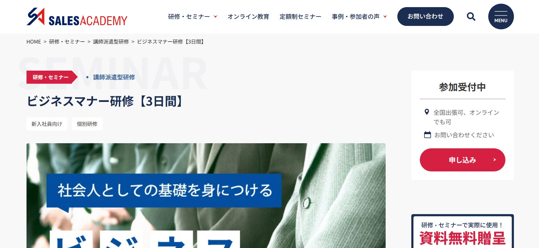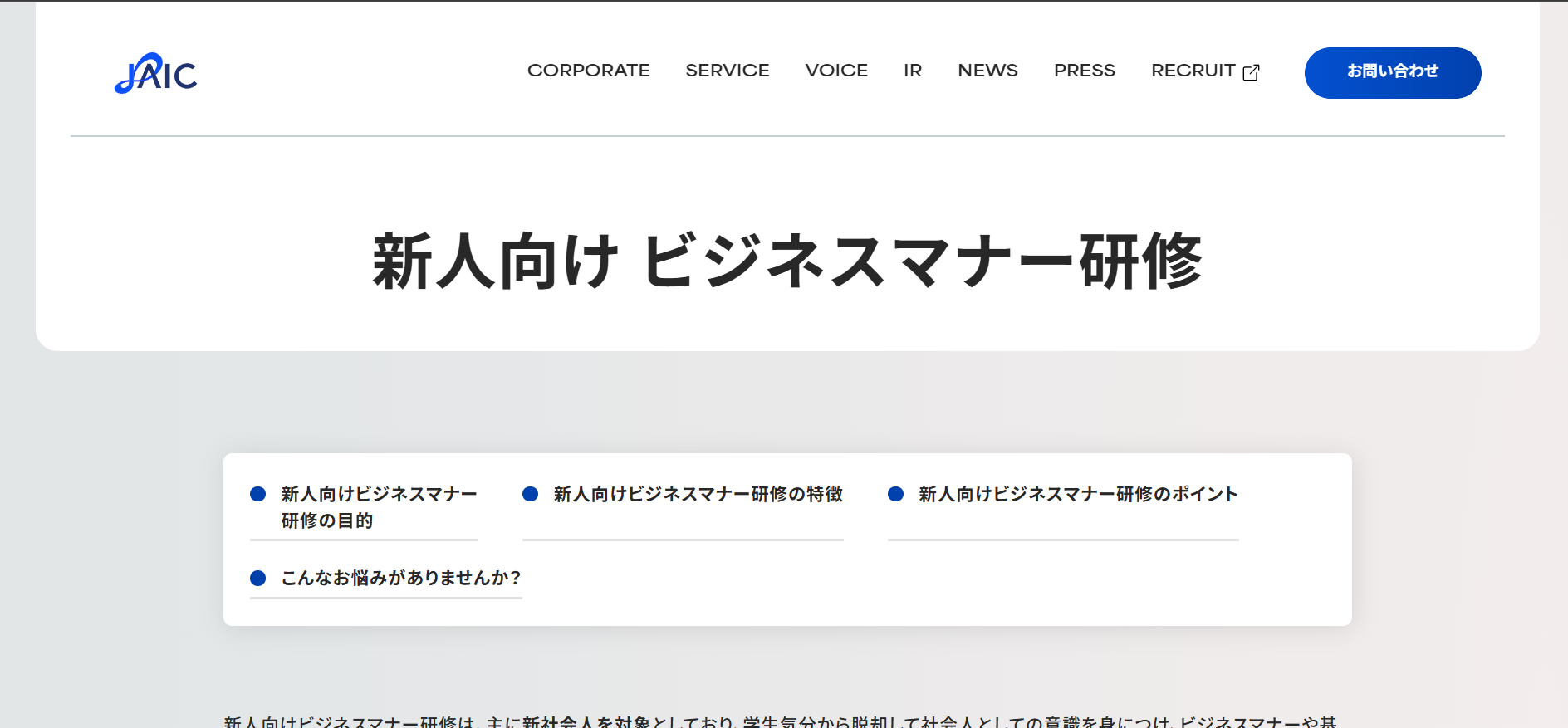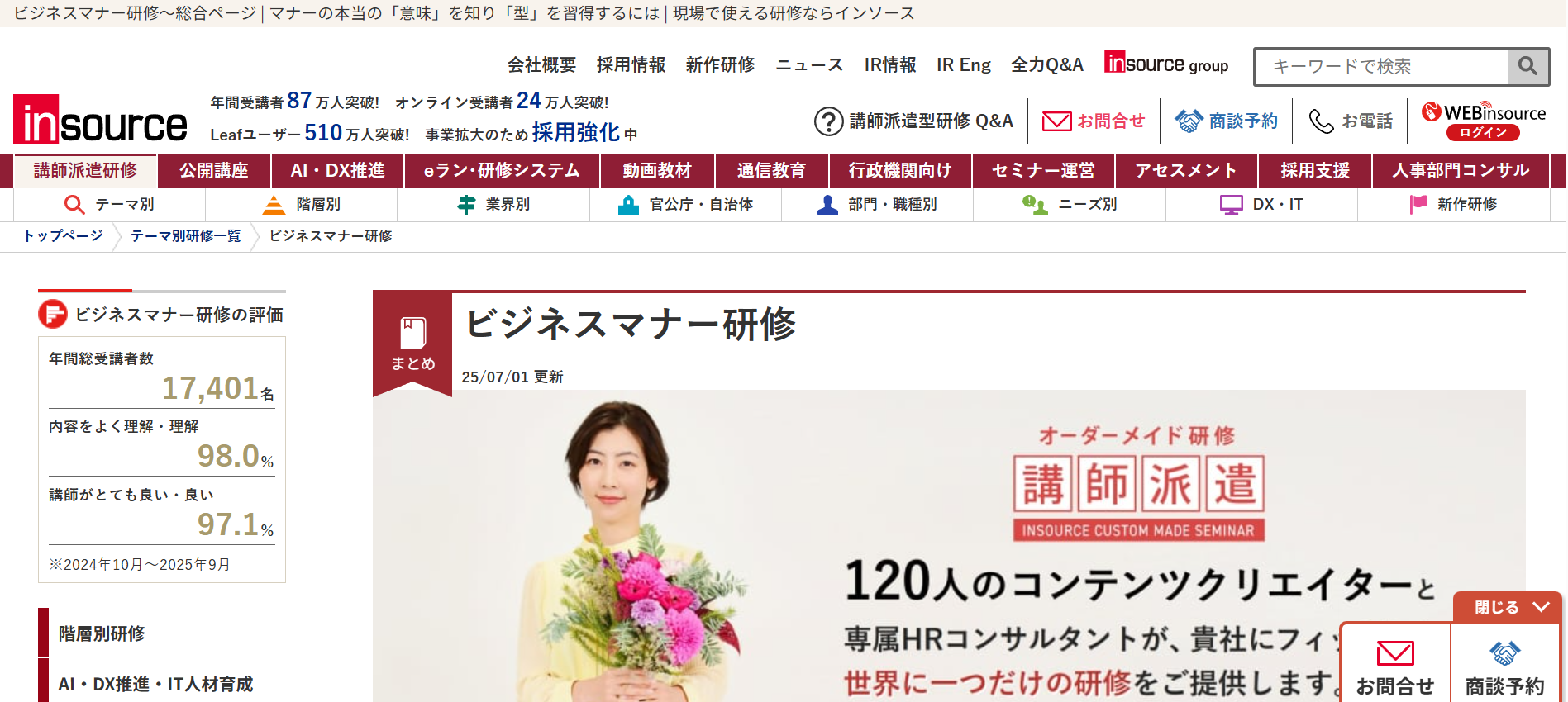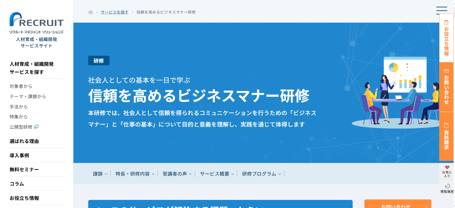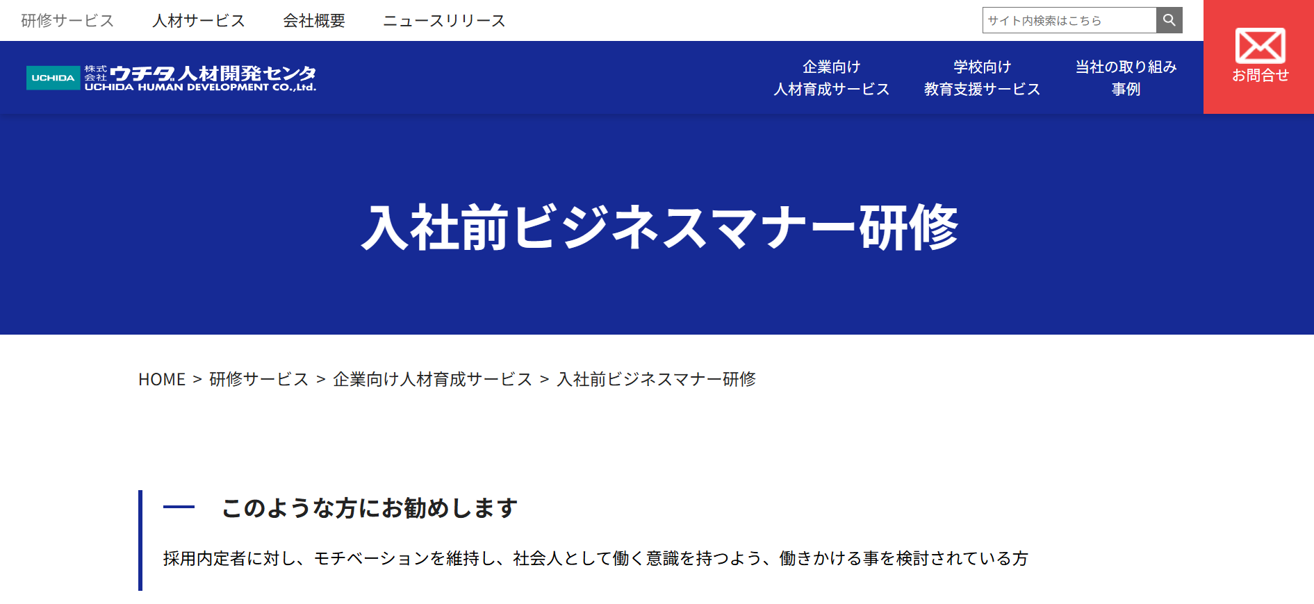 あそぶ社員研修 > お役立ち情報 > 研修ノウハウ > ビジネスマナー研修サービスのおすすめ20選を紹介!特徴・内容を解説 ビジネスマナー研修サービスのおすすめ20選を紹介!特徴・内容を解説 2026.02.03 研修ノウハウ 研修ビジネスマナー 新入社員や内定者に対して、毎年ビジネスマナー研修を実施している会社は多いです。また、さらなるスキルアップのために、若手社員やリーダーを対象に改めてビジネスマナー研修を実施するケースもあります。本記事では、ビジネスマナー研修の実施を検討されている方に向けて、おすすめのビジネスマナー研修サービス20選を紹介します。※本記事に記載の情報は2025年11月時点のものです。各研修サービスの最新情報は公式サイトにてご確認ください。 研修ゲームで楽しく自分事化し、プロ講師によるワークで実務と結びつける 「あそぶ社員研修 総合資料」を無料で受け取る 目次ビジネスマナー研修サービスのおすすめ20選!まとめビジネスマナー研修サービスのおすすめ20選!では早速、ビジネスマナー研修サービスのおすすめ20選を紹介していきます。1.あそぶ社員研修株式会社IKUSAが提供する研修サービス「あそぶ社員研修」には、多くのプログラムで、テーマに関連したアクティビティが取り入れられています。ビジネスマナー研修で実施するのは、「ビジトレ」というアクティビティです。簡単なゲームやクイズを通してビジネスマナーを体験して学んだ後で、ビジネスマナーに関する講義・ワークを行います。研修のなかに「体験」と「楽しさ」をプラスすることで、受講者の主体性や集中力が高まります。テーマについての理解が深まり、翌日から現場で実践できるようになるでしょう。公式サイト:あそぶ社員研修 | ゲーム形式で学習意欲を高めるIKUSAの研修2.株式会社インソース株式会社インソースは、企業の経営課題の解決を幅広くサポートしている会社です。さまざまなテーマの研修サービスも提供しており、公式サイトによると年間の受講者数は87万人以上となっています。株式会社インソースの研修サービスは、講師派遣型研修と公開講座の2種類があります。プログラムの数も豊富で、ビジネスマナー研修1つを取っても、新入社員向けのものだけでなく、全従業員を対象とした研修や、CS(顧客満足度)の向上を目的とした研修、オンラインで受講可能な研修など、目的や受講形態に応じた多様なプログラムが用意されています。公式サイト:株式会社インソース|社員研修・ITによる生産性向上支援3.アチーブメントHRソリューションズ株式会社アチーブメントHRソリューションズ株式会社は、研修サービスの提供や組織開発コンサルティングを行っている会社です。アチーブメントHRソリューションズ株式会社の研修サービスは、知識やスキルだけでなく、マインドセットにもアプローチするよう設計されています。新入社員を対象としたビジネスマナー研修は、2日間の研修プログラムとなっています。1日目は社会人としての心構えや基本動作を、2日目はビジネスシミュレーションで初日に学んだことを実践して身につけるという流れです。2日間で、ビジネスマナーを知っているだけでなく現場で実践できるレベルになることを目指します。公式サイト:社員研修のアチーブメントHRソリューションズ | 人材育成・組織開発コンサルティング | 社員研修のアチーブメントHRソリューションズ4.SMBCコンサルティング株式会社SMBCコンサルティング株式会社は、企業向けの研修やセミナー、組織のコンサルティングを行う会社です。年間2,000本以上の研修やセミナーを開催しているほか、企業の課題に合わせたオーダーメイド研修も提供しています。SMBCコンサルティング株式会社のビジネスマナー研修は、ビジネスマナーの必要性から始まり、身だしなみ、立ち居振舞い、言葉遣い、電話対応、お客様対応などを1日間かけて学ぶ内容となっています。このほか、ビジネスマナーに関するセミナーも多数開催しています。公式サイト:SMBCコンサルティング 教育サイト – SMBCグループが提供する人材育成・社員研修5.ALL DIFFERENT株式会社ALL DIFFERENT株式会社(旧:株式会社ラーニングエージェンシー)は、これまでに2,000社以上の人材育成を支援してきた会社です。ALL DIFFERENT株式会社のビジネスマナー研修は、ビジネスマナーの基礎ともいえる5つの要素(挨拶・表情・身だしなみ・言葉遣い・態度)を、ワークショップを通じて学べる内容となっています。また、上座・下座、名刺交換、電話対応、お茶の出し方など、ビジネスの場面で求められるマナーに着目した研修も用意されています。研修の最後には今後の行動計画を立てる時間が設けられており、実践につながりやすい設計となっています。公式サイト:組織開発・人材育成|ALL DIFFERENT(旧:ラーニングエージェンシー)6.ANAビジネスソリューション株式会社ANAビジネスソリューション株式会社は、教育・研修や人材派遣、人材紹介などのサービスを提供して