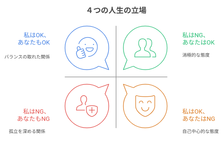 あそぶ社員研修 > お役立ち情報 > 交流分析とは?4つの基本理論と「人生の立場」について解説 交流分析とは?4つの基本理論と「人生の立場」について解説 2025.11.12 この記事の監修者 株式会社IKUSA あそぶ社員研修事業部 責任者 友水 一喜 慶應義塾大学文学部美学美術史学専攻卒業。 クラシック音楽業界にて制作・マネジメント・プロデュースに従事。アートと教育の融合をテーマに、「体験を学びとして届ける」手法を追求してきた。その後、体験型コンテンツ会社を経て、株式会社IKUSAにクリエイティブプロデューサーとして入社。 現在は研修事業部の責任者として、体験型・ゲーム型の社員研修事業を統括している。 ユーザー視点に立ったサービス開発を得意とし、「楽しさが行動変容を生む」という信念のもと新しい研修体験を創出している。 職場の雰囲気や人間関係が悪くなると、情報の伝達や意思疎通が十分にできず、業務がスムーズに進まなくなったり、ミスやトラブルが発生してしまったりすることがあります。また、社員が大きなストレスを感じて、心身に不調をきたすこともあるかもしれません。そこで今回は、職場の人コミュニケーション活性化やメンタルヘルス対策に役立つ「交流分析」を、わかりやすく解説します。交流分析とは何か、基本的な概念である「ストローク」、4つの基本理論と「人生の立場」について、詳しく見ていきましょう。 研修ゲームで楽しく自分事化し、プロ講師によるワークで実務と結びつける 「あそぶ社員研修 総合資料」を無料で受け取る 目次交流分析とは交流分析における4つの基本理論4つの「人生の立場」まとめ交流分析とは交流分析とは、アメリカの精神科医のエリック・バーン氏により、1950年代半ばに開発された心理学理論、およびそれに基づく心理療法です。正式名称は「Transactional Analysis」で、略して「TA」と呼ばれることもあります。精神分析をベースに、人間性心理学を取り入れて開発された交流分析は、「精神分析の口語版」ともいわれています。交流分析を学ぶと、日々のコミュニケーションが変わります。人間関係の改善や、自己実現に役立つでしょう。交流分析は、もともとは治療のための心理療法でした。しかし現在では、教育やビジネス、医療、介護、子育てなど、幅広い分野で活用されています。職場では、コミュニケーション活性化や、メンタルヘルス対策としても役立てられています。まずは「ストローク」を理解しよう交流分析の基本的な概念に、「ストローク」というものがあります。ストロークとは、交流分析心理学のなかのコミュニケーション理論のことで、簡単に表すと「他者とのかかわり」のことをいいます。たとえば、撫でる、抱きしめるといった触れ合いや、言動や表情、態度などです。子どもの頃は、抱っこや頬ずりなどの身体的なストロークが多いですが、成長とともに、表情や態度などの精神的なストロークが多くなっていきます。厚生労働省のメンタルヘルスに関するポータルサイト「こころの耳」では、ストロークは“「あなたという存在を認めているよ」という存在認知のメッセージ”であり、人格を形成する“心の栄養”であると表現されています。参考:15分でわかるはじめての交流分析1 – こころの耳(厚生労働省)(PDF)これまでにどのようなストロークを受け取ってきたか、そしてそれをどのように感じ取ってきたかによって、個性や人生観、生き方も決まっていくというのが、交流分析の考え方です。ストロークには、「肯定的ストローク」と「否定的ストローク」の2種類があります。肯定的ストローク「肯定的ストローク」とは、心が軽くなったり、あたたかい気持ちになったりするストロークのことをいいます。たとえば、「あなたのことが大好き」「あなたがいてくれて本当によかった」などです。人は、このような自分の存在そのものに対して無条件に与えられる肯定的ストロークを求めています。無条件の肯定的ストロークを受け取ると、自分で自分の価値を認識できるようになり、前向きな気持ちになって、自信も湧いてくるのです。肯定的ストロークのなかには、「テストで学年一位になるなんて、すごいじゃない」のように、行動や結果に対して与えられる条件付きのストロークもあります。条件付きの肯定的ストロークは、相手から「次回もがんばろう」というやる気やモチベーションを引き出すことができますが、伝え方によっては、「成績が良くないと褒めてもらえない」「次回順位が下がったらどうしよう」などと、相手が自信を無くしてしまうこともあります。特に、子どもの頃に親から条件付きのストロークばかりを与えられると、自分を好きになれなかったり、反抗的になったりする可能性もあるといわれています。否定的ストローク「否定的ストローク」とは、心が不快になるストロークのことをいいます。たとえば、「あなたのことが嫌い」「あなたって、いてもいなくても変