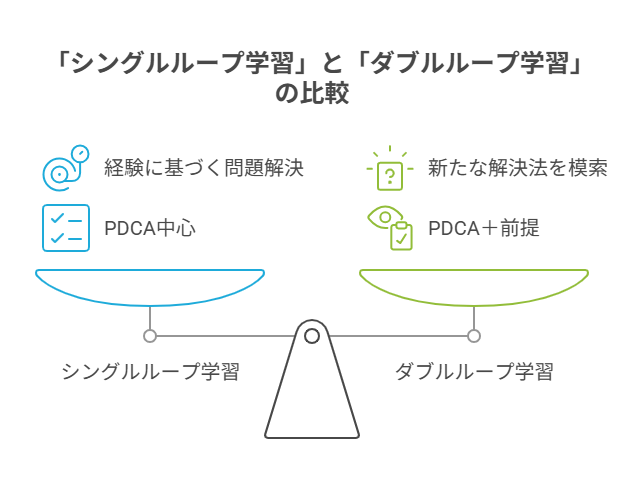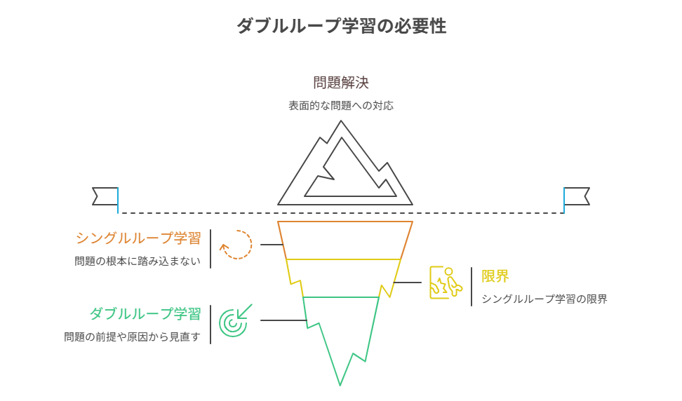 あそぶ社員研修 > お役立ち情報 > 学習法 > ダブルループ学習とは?具体例や有効なフレームワークを解説 ダブルループ学習とは?具体例や有効なフレームワークを解説 2026.02.20 学習法 PDCA この記事の監修者 株式会社IKUSA あそぶ社員研修事業部 責任者 友水 一喜 慶應義塾大学文学部人文社会学科美学美術史学専攻卒業。 大学卒業後、クラシック音楽業界にて制作・マネジメント・プロデュースに従事し、アートと教育の融合をテーマに、「体験を学びとして届ける」手法を追求してきた。その後、体験型コンテンツ会社を経て、株式会社IKUSAにクリエイティブプロデューサーとして入社。現在は研修事業部の責任者として、体験型・ゲーム型の社員研修事業を統括している。 ユーザー視点に立ったサービス開発を得意とし、「楽しさが行動変容を生む」という信念のもと新しい研修体験を創出している。 日々の業務を進めていくなかで、ロジックにもとづいて改善を続けているのに、あまり改善されず、効果が出ないと感じることはないでしょうか。それは前提としている既存の取り組み方や目的自体に問題があるのかもしれません。そうはいっても「今までやってきたことだから」と長く続けていることや、「それしかできないから」と思い込んでいることほど、やめることは難しいものです。しかし、そういった前提にとらわれず、根本から考え直すことで新しいアプローチを生み出すのがダブルループ学習です。ダブルループ学習を用いることで目の前の課題に対処できる、あるいは、そこに課題などなかったことに気づくことができるかもしれません。本記事では、ダブルループ学習とはなにか、ダブルループ学習が必要な理由、ダブルループ学習を実施するメリット、有効なフレームワーク、成功させるポイントを解説します。 楽しいからこそ学びは定着する 研修ゲームと振り返り・体系的な学びでPDCAを実践できる 「あそぶ社員研修 資料」を無料で受け取る 目次ダブルループ学習とはダブルループ学習が必要な理由ダブルループ学習のメリットダブルループ学習に有効なフレームワークダブルループ学習を成功させるポイントまとめダブルループ学習とはダブルループ学習とは、ハーバード大学の教授クリス・アージリスが提唱した概念で、問題が発生したとき、既存の方法や仕組みを捨て、新しいアプローチをしながら問題解決をすることです。発生した問題を対処するだけではなく、これまで正しいと思っていた根本的なところにも目を向け、改革をおこなうことともいえます。例として「夜間のタスクが終わらない」という問題に対して、「夜更かしをして、時間を費やして終わらせる」という対応方法が挙げられます。しかし、これはあまりに直接的で、効率のよい解決方法とはいえないでしょう。これをもう少し俯瞰すると「夜間は疲れているので効率が上がらない」と分析でき、「夕方に長めの休憩を入れることで夜間の集中力を高める」という対応方法も挙げられるかもしれません。ただし、これも対処療法的であり、根本的な解決には至っていません。ダブルループ学習では根本的なところから考えていきます。そもそも「夜間は疲れている」という事実があるのであれば、そもそも本当に夜間にやらなければいけない作業なのか、夜間である必要性はあるのか、といった前提の部分に問いかける必要があります。その結果、「夜間の作業は昔からおこなっているなんとなくの慣習だった」など、必要性が感じられないことがわかれば「能率が悪いため夜間の作業はなくし、代わりに早朝に作業をする」という改革をおこなうことができます。こうした、ひとつの認識にとらわれず、広い視野で考えることができるのがダブルループ学習の特徴です。ダブルループ学習の進め方ダブルループ学習は以下のようなステップで進めていきます。問題を明確にし、現状を把握すること。この段階では事実にもとづいた情報を集めるだけでよい。前提となる部分に疑問を働きかける。既存の概念にとらわれずに、あるいは棄却して、問題を解決するための新しいアプローチを考える。考えたアプローチを実行し、どのような結果が得られたのかフィードバックをおこなう。これにより、現状の問題点を把握し、根本的な部分から解決することができます。シングルループ学習との関係シングルループ学習とは、過去の成功体験に沿って問題解決をすることです。ダブルループ学習の主題が「適切な課題に取り組めているか」だとすると、シングルループ学習の主題は「課題に適切に取り組めているか」になります。例として「PDCAサイクル」がシングルループ学習に属します。「PDCAサイクル」とは、Plan(計画)→Do(実行)→Check(評価)→Action(改善)という4つのフェーズを繰り返すことで業務改善をおこなうものです。現在あるものに対し、改善を繰り返すため、質は自然と高まっていきます。その反面で、根本が変わるわけでは