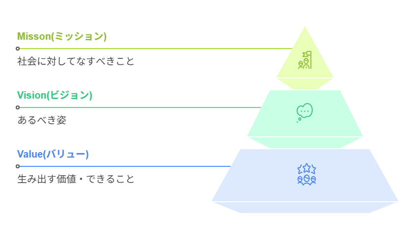 あそぶ社員研修 > お役立ち情報 > 組織・人材開発 > MVV(ミッション・ビジョン・バリュー)の企業例20選 MVV(ミッション・ビジョン・バリュー)の企業例20選 2025.10.28 組織・人材開発 この記事の監修者 友水 一喜 株式会社IKUSA あそぶ社員研修事業部 責任者 MVVは、企業の社会に対する関わり方や生み出す価値を表現しています。MVVを策定するにはどのような切り口から考えていく必要があるのでしょうか。本記事では、MVV(ミッション・ビジョン・バリュー)の企業例を20選紹介します。 研修ゲームで楽しく自分事化し、プロ講師によるワークで実務と結びつける 「あそぶ社員研修 総合資料」を無料で受け取る 目次MVVとは自社事業が重視されたMVVの企業例7選社会づくりが重視されたMVVの企業例8選顧客との関係性が重視されたMVVの企業例3選グローバルな視点が重視されたMVVの企業例2選MVVの浸透には「謎パ」がおすすめまとめMVVとはMVVとは、「Mission(ミッション)」、「Vision(ビジョン)」、「Value(バリュー)」の頭文字をとった言葉です。ミッションは「社会に対してなすべきこと」、ビジョンは「あるべき姿」、バリューは「生み出す価値・できること」を表しています。MVVの設定は、さまざまな価値観を持つ社員や顧客、提携先などが、協力して最大限の力を発揮できるようにすることが目的です。それぞれの目的や考え方などを統一し、一丸となって事業に取り組むためにもMVVの設定は必要とされています。 楽しさだけで終わらない。楽しいから自発的に参加でき、協働体験が従業員同士の繋がりを強める。感情と学びを結びつけエンゲージメントが向上する研修。「あそぶ社員研修 資料」を無料で受け取る 自社事業が重視されたMVVの企業例7選自社事業の内容に重点を置いているMVVの企業例を紹介します。1.トヨタ自動車株式会社ミッションわたしたちは、幸せを量産するビジョンモビリティを社会の可能性に変えるバリューソフトとハードを融合し、パートナーとともに「トヨタウェイ」という唯一無二の価値を生み出す出典:TOYOTA|トヨタフィロソフィー日本を代表する自動車メーカーのトヨタ自動車株式会社は、創業以来受け継がれてきた「豊田綱領」という、創業者豊田佐吉の考えを経営の核としてきました。バリューには、顧客、社会、コミュニティ、社員、ステークホルダーを「パートナー」と捉え、ともに唯一無二の価値を生み出すという思いが込められています。2.ソニー株式会社ミッションテクノロジーの力で未来のエンタテインメントをクリエイターと共創するビジョン世界中の人に感動を提供し続けるバリュー―出典:ソニー株式会社|ミッション/ビジョンカメラやイヤホンなどの商品開発を手掛けるソニー株式会社は、テクノロジーの力で実現することや、誰と関わっていきたいかなどに注目してミッション・ビジョンを定めています。技術を提供することでクリエイターの創作の可能性を広げ、顧客へ予想以上のエンタテインメントを届けるビジョンを描いています。3.ソフトバンクグループ株式会社ミッション情報革命で人々を幸せにビジョン「世界に最も必要とされる会社」を目指してバリューNo.1挑戦逆算スピード執念出典:SoftBank|理念・ビジョン・戦略ソフトバンクグループ株式会社では、誰もが便利で快適に、安全な生活を送れるよう、同社の強みであるデジタルテクノロジーで貢献することで、ビジョンの達成を目指しています。バリューには「努力って、楽しい」という創業者の想いが込められており、通信業という変化の激しい事業環境に対応するうえで大切な考え方を定めています。4.サントリーミッション人と自然と響きあい、豊かな生活文化を創造し、「人間の生命いのちの輝き」をめざす。ビジョン―バリューGrowing for Goodやってみなはれ利益三分主義出典:SUNTRY|グループ企業理念飲料メーカーであるサントリーは、同社の事業の根幹を支える「水」に多くのメッセージを託しているのが特徴です。ミッション(パーパス)に掲げられている「人間の生命いのちの輝き」は、創業時代から受け継がれてきた社是にある言葉であり、現在も継承されています。5.リクルートホールディングスミッションまだ、ここにない、出会い。より速く、シンプルに、もっと近くに。ビジョンFollow Your Heartバリュー新しい価値の創造 / Wow the World個の尊重 / Bet on Passion社会への貢献 / Prioritize Social Value出典:リクルートホールディングス|ビジョン・ミッション・バリューズ人材業界企業であるリクルートは、必要な情報を求めるユーザーと企業が出会うプラットフォームづくりをビジネスモデルとしてきた企業です。バリューやミッションは一人ひとりの価値観や好奇心などに言及しており、企業全体とは別に「個」の視点が強く反映されています。6.キリンホールディングス株式会社ミッションキリングループは、自然と人を見つめるものづくりで、「食と健康」の新たなよろこびを広げ、こころ豊かな社会の実現に貢献します