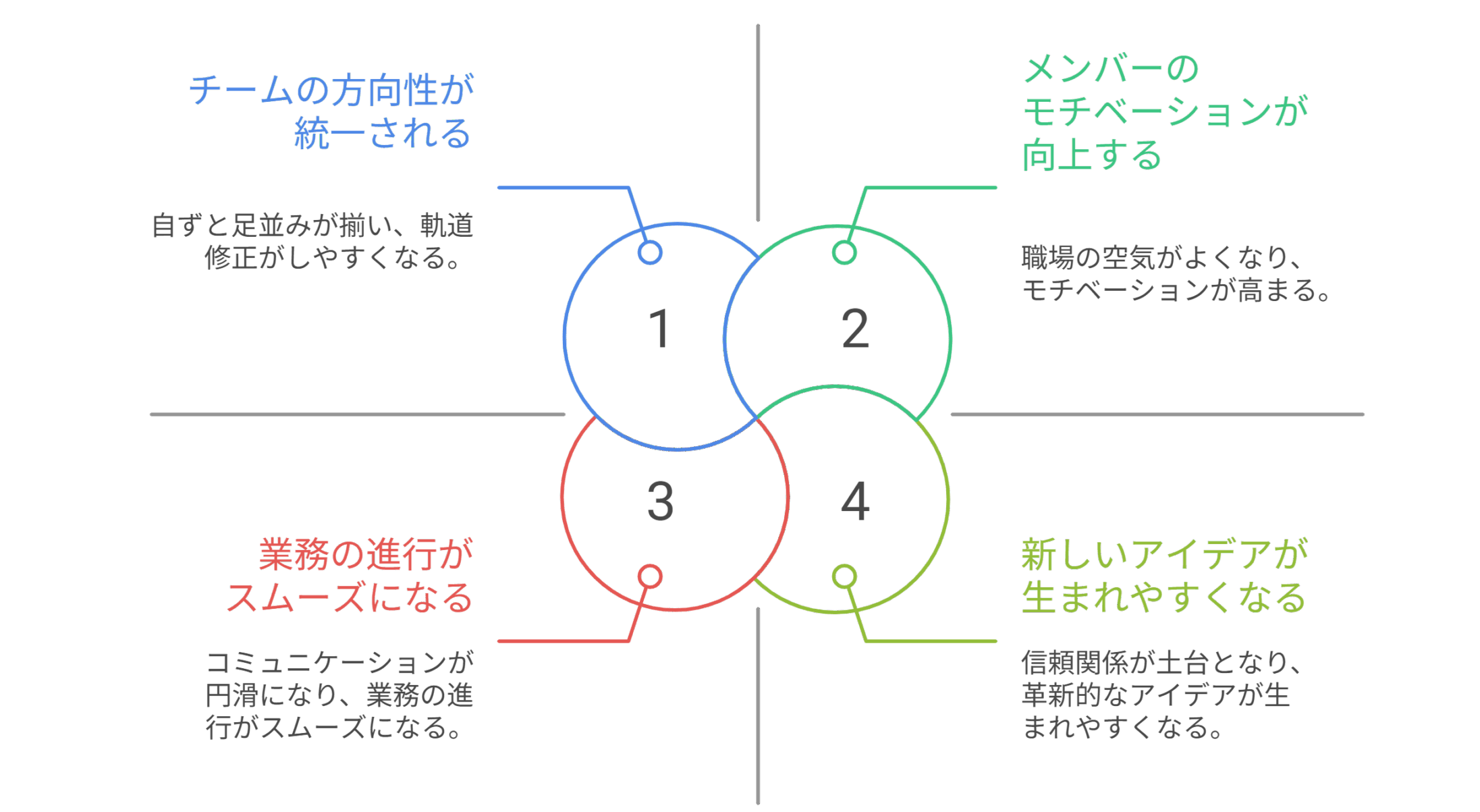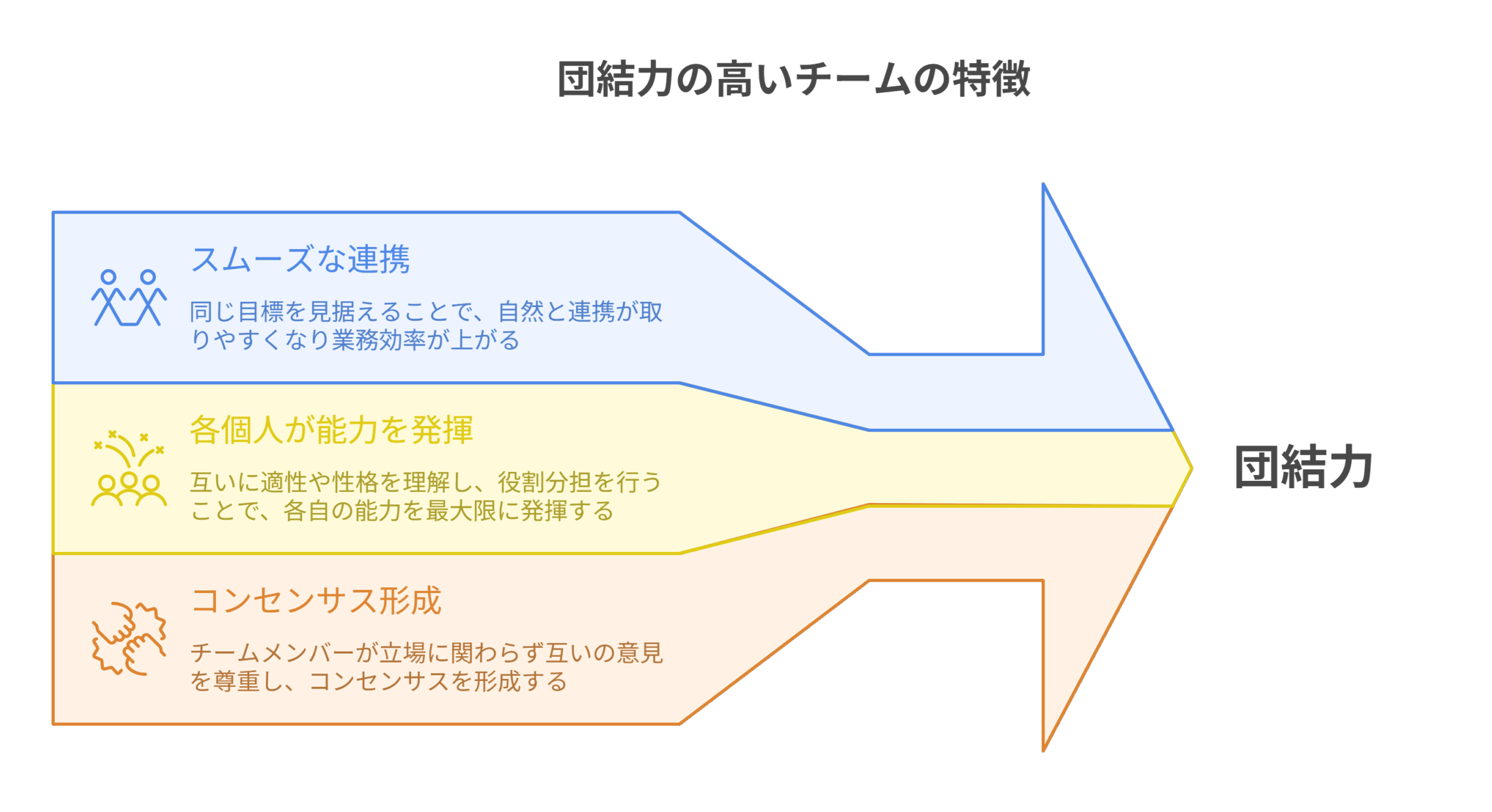 あそぶ社員研修 > お役立ち情報 > 組織・人材開発 > 団結力を高める方法15選!チームの特徴・低下する原因も解説 団結力を高める方法15選!チームの特徴・低下する原因も解説 2025.11.25 組織・人材開発 この記事の監修者 株式会社IKUSA あそぶ社員研修事業部 責任者 友水 一喜 慶應義塾大学文学部美学美術史学専攻卒業。 クラシック音楽業界にて制作・マネジメント・プロデュースに従事。アートと教育の融合をテーマに、「体験を学びとして届ける」手法を追求してきた。その後、体験型コンテンツ会社を経て、株式会社IKUSAにクリエイティブプロデューサーとして入社。 現在は研修事業部の責任者として、体験型・ゲーム型の社員研修事業を統括している。 ユーザー視点に立ったサービス開発を得意とし、「楽しさが行動変容を生む」という信念のもと新しい研修体験を創出している。 チームの団結力が高まれば連携できるようになり、生産性が高まります。また、心理的安全性が高まることで、メンバーのパフォーマンスやエンゲージメントなどが向上することも期待できます。本記事では、団結力が高いチームの特徴、研修などで団結力を高める方法や低下する原因を紹介します。 研修ゲームで楽しく自分事化し、プロ講師によるワークで実務と結びつける 「あそぶ社員研修 総合資料」を無料で受け取る 目次団結力が高いチームの特徴団結力を高めるメリットチームの団結力を高める方法15選チームの団結力が低下する原因まとめ団結力が高いチームの特徴団結力が高いチームの特徴を紹介します。スムーズに連携が取れている団結力が高いチームは、全員が同じ目標を見据えられているため、自然と連携がとりやすくなり業務効率が上がります。また、連携がよく取れていれば互いに協力する意識が生まれ、発生したトラブルに対して力を合わせて解決したり、業務上のミスをカバーしたりすることにもつながるでしょう。チームの全員が能力を発揮できている団結力の高いチームは、互いに適性や性格を理解し、各々が役割を担うことで、全員が能力を発揮することができます。能力が発揮できればメンバーが仕事に対してモチベーションを高く保て、チーム全体の士気が上がります。コンセンサスを取れる団結力が高いチームは、立場に関わらず意見を伝え、それを互いに尊重するため、コンセンサスを取る(意見を一致させる)ことができます。「コンセンサスを取る」とは、影響力の強いメンバーの意見や多数決による決定を重視せず、全員の意見を集め、話し合いを通じて全員が納得する答えを導き出すことです。話し合いを通じて正解に近い結論に至れるため、成果向上につながります。 楽しさだけで終わらない。楽しいから自発的に参加でき、協働体験が従業員同士の繋がりを強める。感情と学びを結びつけエンゲージメントが向上する研修。「あそぶ社員研修 資料」を無料で受け取る 団結力を高めるメリットチームの団結力が高まることのメリットを紹介します。チームの方向性が統一される団結力が高いと、チームの方向性が統一されます。団結力が高いチームは、メンバーの一人ひとりが目標に納得している状態なので、自ずと足並みが揃い、軌道修正がしやすくなります。方向性が定まっていないと、判断を逐一リーダーに仰がねばならなくなり、業務を効率的に進められません。各メンバーが自走できないことで、業務が進行しにくくなり、業務への意欲が低下してしまうおそれがあります。メンバーのモチベーションが向上するチームの団結力が高いと、職場の空気が居心地のよいものになり、仕事へのモチベーションが高まります。モチベーションを維持しやすい環境は、会社への愛着形成にもつながるでしょう。会社へ貢献したいと思えることで、業務の効率がより上がるという好循環を生み出せます。業務の進行がスムーズになるメンバーの団結力を高めることで、コミュニケーションが円滑になり、業務の進行がスムーズになります。連携が取れることで、各メンバーが主体的に動きやすくなるため、業務の質が上がっていくでしょう。各メンバーの推進力の高さは、企業全体のパフォーマンス向上につながり、企業全体が活性化します。新しいアイデアが生まれやすくなる団結力を高めることでコミュニケーションが活性化され、新しいアイデアが生まれやすくなります。建設的な話し合いには、意見が尊重され、オープンに議論できる環境が必要です。団結力を高めることでつくられる信頼関係が土台となり、よく議論されなければ生まれなかった革新的なアイデアや解決策を提案できるようになるでしょう。チームの団結力を高める方法15選メンバーの団結力を高める方法を紹介します。⇒「チームビルディング研修」の資料を受け取る1.心理的安全性を高める心理的安全性とは、立場に関係なく自分の意見を言える状態を指します。本音で話し合える環境を整えることが、団結力を強める第