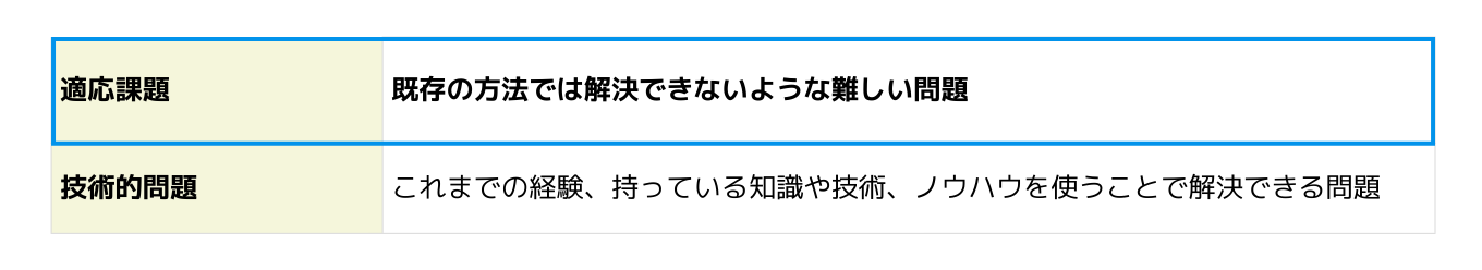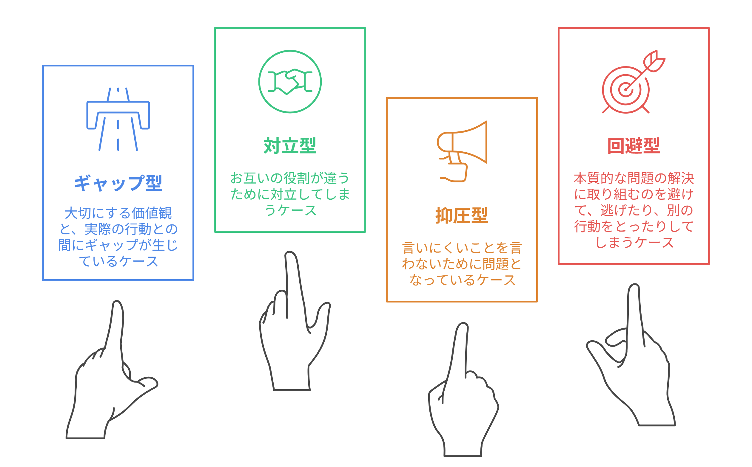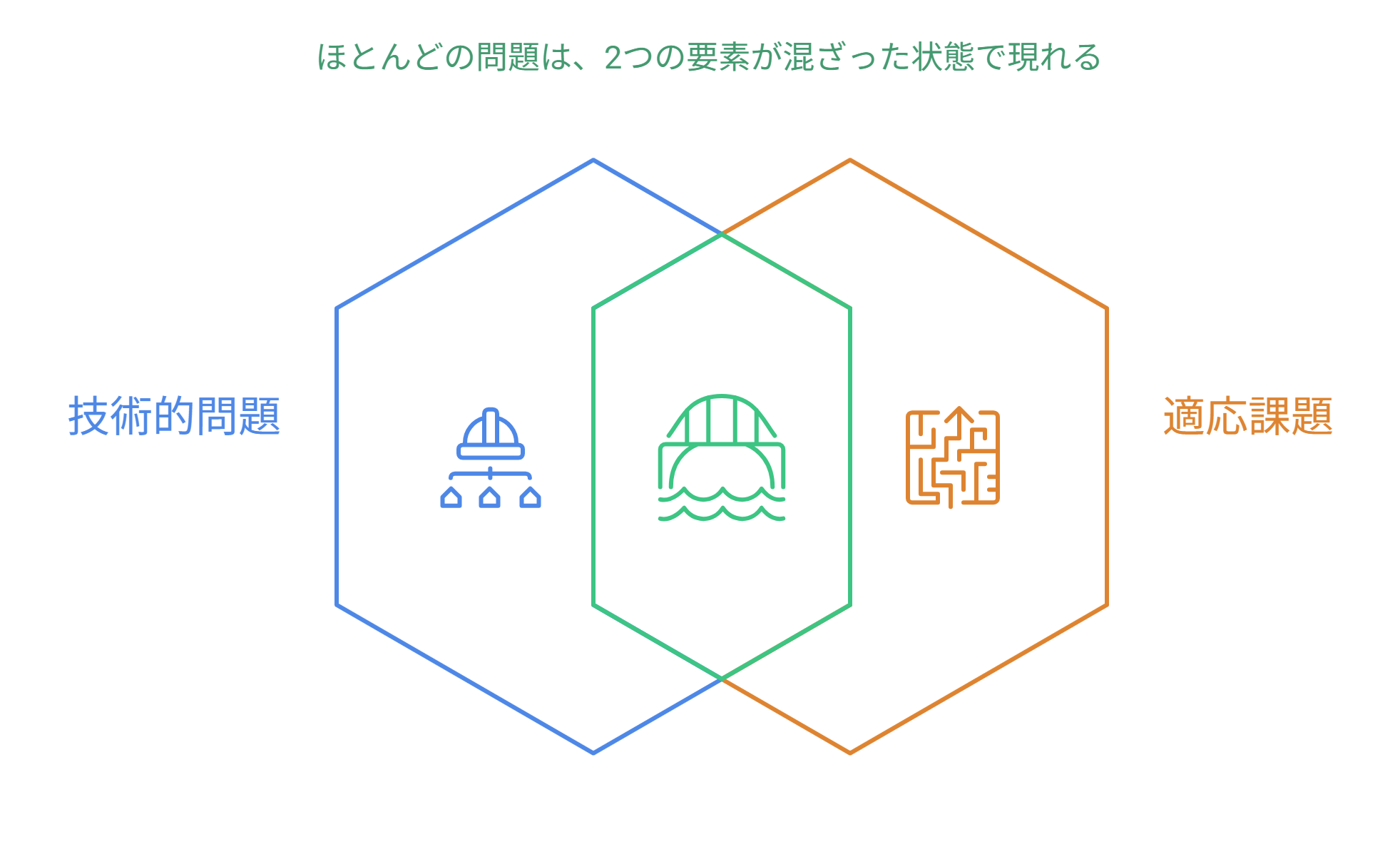 あそぶ社員研修 > お役立ち情報 > 組織・人材開発 > 適応課題とは?意味、技術的問題との違い、4つのタイプを解説 適応課題とは?意味、技術的問題との違い、4つのタイプを解説 2025.11.25 組織・人材開発 この記事の監修者 友水 一喜 株式会社IKUSA あそぶ社員研修事業部 責任者 ビジネスシーンでは、日々さまざまな問題が起こっています。あらゆる問題のなかでも、解決するのが難しいといわれているのが、「適応課題」と呼ばれる問題です。本記事では、適応課題とは何か、技術的問題との違い、適応課題の4つのタイプを解説します。そして、問題を解決するために必要なアプローチと、適応課題を解決するためにマネジャーに求められることも紹介します。 楽しいからこそ学びは定着する 研修ゲームと振り返り・体系的な理論でロジカルシンキングを実践できる 「あそぶ社員研修 資料」を無料で受け取る 目次適応課題とは?技術的問題との違い適応課題の4つのタイプ問題を解決するには両方からのアプローチが必要適応課題解決のためにリーダー・マネジャーに求められるものまとめ適応課題とは?技術的問題との違いハーバード・ケネディ・スクールのロナルド・A・ハイフェッツ氏は、世のなかで起こるさまざまな問題には、技術的問題(テクニカル・プロブレム)と適応課題(アダプティブ・チャレンジ)の2種類があると主張しています。技術的問題とは、既存の知識やノウハウで解決可能な問題のことです。適応課題とは、それらを使って解決できない問題のことをいいます。それぞれについて、詳しく見ていきましょう。技術的問題技術的問題とは、これまでの経験、持っている知識や技術、ノウハウを使うことで解決できる問題のことをいいます。たとえば、次のような問題は技術的問題といえるでしょう。機械が故障した → 解決策:修理するWeb会議ツールを使いこなせない従業員がいる → 解決策:マニュアルを作るこのような問題は、知識やスキルの量や質を高めることで、対処できることも増えていきます。今はスキルが足りなくてできないことがあったとしても、それを学び、習得すれば解決できるようになります。また、問題を解決するために高い専門知識やスキルが必要であれば、外部の専門家に解決してもらうことができるというのも、技術的問題の特徴です。適応課題適応課題とは、既存の方法では解決できないような難しい問題のことです。適応課題は、当事者がその状況に「適応」することでしか解決できません。たとえば、次のような問題が挙げられます。求人を出しているが、古い体質の企業であるためか若い世代の選考辞退率が高い。業務効率化のためにある部署にITツールの導入を提案しているが、どれだけ説明しても何らかの理由をつけて断られる。上の例の場合、選考のやり方やコミュニケーションのとり方を工夫して人材を採用できたとしても、選考辞退率が高い原因が「企業の体質が古いこと」であるなら、入社後にギャップを感じて早期に離職されてしまう可能性が高いでしょう。これでは、何も問題は解決できていません。下の例の場合は、ITツールを導入することで、何か不都合が生じる恐れがあるために断り続けている可能性が考えられます。また、新型コロナウイルス感染拡大も、まさに適応課題だったといえるでしょう。オフィスに出社できなくなったためテレワークを導入した、対面で営業をするのが難しくなったためインサイドセールスを始めたという企業も多いのではないでしょうか。これらを実現するには、これまでの「当たり前」を手放して、考え方や習慣を変える必要があったはずです。このように、どうすれば状況に適応できるかを考え、当事者自身が変わることでしか解決できない問題を、適応課題といいます。人が問題の一部であるというのも、適応課題の特徴といえるでしょう。 楽しさだけで終わらない。楽しいから自発的に参加でき、協働体験が従業員同士の繋がりを強める。感情と学びを結びつけエンゲージメントが向上する研修。「あそぶ社員研修 資料」を無料で受け取る 適応課題の4つのタイプ適応課題には、ギャップ型、対立型、抑圧型、回避型という4つのタイプがあるとされています。ギャップ型ギャップ型とは、大切にする価値観と、実際の行動との間にギャップが生じているケースです。たとえば、企業として「残業はパフォーマンスが落ちるのでよくないもの」と考えているのにもかかわらず、業務量が多く、社員から目立った不満も出ていないので、なかなか体制を変えられないといったケースが、このタイプに当てはまるでしょう。対立型対立型とは、お互いの役割が違うために対立してしまうケースです。たとえば、受注競争に勝つために価格を下げてほしい営業部門と、できるだけコストを抑えたい生産部門とが対立してしまうといったケースが、このタイプに当てはまります。抑圧型抑圧型とは、言いにくいことを言わないために