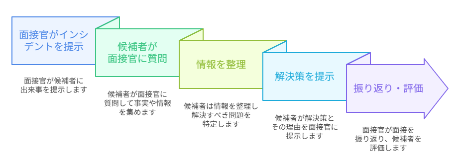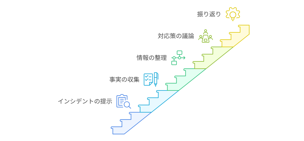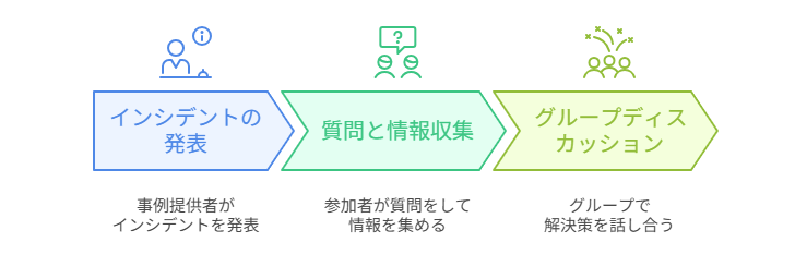 あそぶ社員研修 > お役立ち情報 > フレームワーク > インシデントプロセス法とは?メリット・デメリット、事例研究の進め方を解説 インシデントプロセス法とは?メリット・デメリット、事例研究の進め方を解説 2025.11.20 フレームワーク この記事の監修者 株式会社IKUSA あそぶ社員研修事業部 責任者 友水 一喜 慶應義塾大学文学部美学美術史学専攻卒業。 クラシック音楽業界にて制作・マネジメント・プロデュースに従事。アートと教育の融合をテーマに、「体験を学びとして届ける」手法を追求してきた。その後、体験型コンテンツ会社を経て、株式会社IKUSAにクリエイティブプロデューサーとして入社。 現在は研修事業部の責任者として、体験型・ゲーム型の社員研修事業を統括している。 ユーザー視点に立ったサービス開発を得意とし、「楽しさが行動変容を生む」という信念のもと新しい研修体験を創出している。 インシデントプロセス法とは、事例研究法の一つです。企業においては、社員の分析力や判断力、問題解決力、職務遂行能力などのスキルを高めたいときや、管理職登用のアセスメント方法としても用いられています。本記事では、まずインシデントプロセス法とはどういったものか、そもそもインシデントとは何を意味するのかを、わかりやすく解説します。その上で、インシデントプロセス法による事例研究のメリットとデメリット、具体的な進め方、さらに、インシデントプロセス法を採用面接に応用した「インシデントプロセス面接」についても紹介します。 楽しいからこそ学びは定着する 研修ゲームと振り返り・体系的な理論でロジカルシンキングを実践できる 「あそぶ社員研修 資料」を無料で受け取る 目次インシデントプロセス法とはインシデントプロセス法による事例研究のメリット・デメリットインシデントプロセス法の進め方採用面接に応用した「インシデントプロセス面接」とはまとめインシデントプロセス法とはインシデントプロセス法とは、マサチューセッツ工科大学のピコーズ教授夫妻によって考案された事例研究法です。事例研究法とは、過去に起こった出来事を詳しく分析して、問題の解決方法を探るというもので、ケーススタディとも呼ばれています。インシデントプロセス法の進め方についてはのちほど詳しく紹介していますが、まずは事例提供者が実際に起こった出来事(インシデント)を発表します。そして、参加者は事例提供者に一問一答式で質問をしながら必要な情報を集め、グループで話し合って解決方法を考えるというのが基本的な流れです。この過程の中で、参加者の分析力や判断力、問題解決力、職務遂行能力などのスキルの向上が期待できます。一般的なケーススタディは、事例提供者は取り上げる事例を決めたら、その事例を参加者に理解してもらうために資料などを準備しなければなりません。対してインシデントプロセス法は、事例提供者の短く抽象的な出来事の発表をもとに、参加者が質問により事例の全体像を組み立てていくものなので、事例提供者の準備の負担が少なく、さまざまな分野で広く用いられています。⇒「ロジカルシンキング研修」の資料を受け取る⇒「クリティカルシンキング研修」の資料を受け取る ケーススタディの概要については、以下の記事で詳しく紹介しています。関連記事:ケーススタディとは?実施するメリットや進め方、注意点を解説インシデントとはインシデント(incident)は、「出来事」や「事件」などの意味を持つ英単語です。似た意味を持つ言葉にアクシデント(accident)がありますが、こちらは「思いがけない出来事」や、「事故」「災難」など、大きな損害や影響が発生してしまった出来事を指します。対して、ビジネスシーンで用いられるインシデントとは、「一歩間違えればアクシデントになる可能性があった出来事」のことをいいます。たとえば、以下の例が挙げられます。不正アクセスなどのサイバー攻撃による情報漏洩サービスの中断や品質の低下など、正常なITサービスの利用を妨げる出来事鉄道運転事故にはならなかったものの、事故につながる恐れが高かった事例医療の現場において、治療や処置が間違っていると患者に施す前に気づいた場合ヒヤリハットとの違いヒヤリハットとは、その名のとおり、事故には至らなかったものの、「ヒヤッ」としたり「ハッ」としたりした出来事のことです。インシデントとほぼ同じ意味で使われることも多いですが、「ヒヤッ」「ハッ」と感じなくても、事故の一歩手前の出来事が起これば、それはインシデントが発生したことになります。また、ヒヤリハットは主に人的ミスにより生じる出来事を指します。対してインシデントは、前項の例でいうならサイバー攻撃やサービスの品質の低下など、人的ミス以外の要因により発生することもあります。 楽しさだけで終わらない。楽しいから自発的に参加でき、協働体験が従業員同士の繋がりを強める。感情と