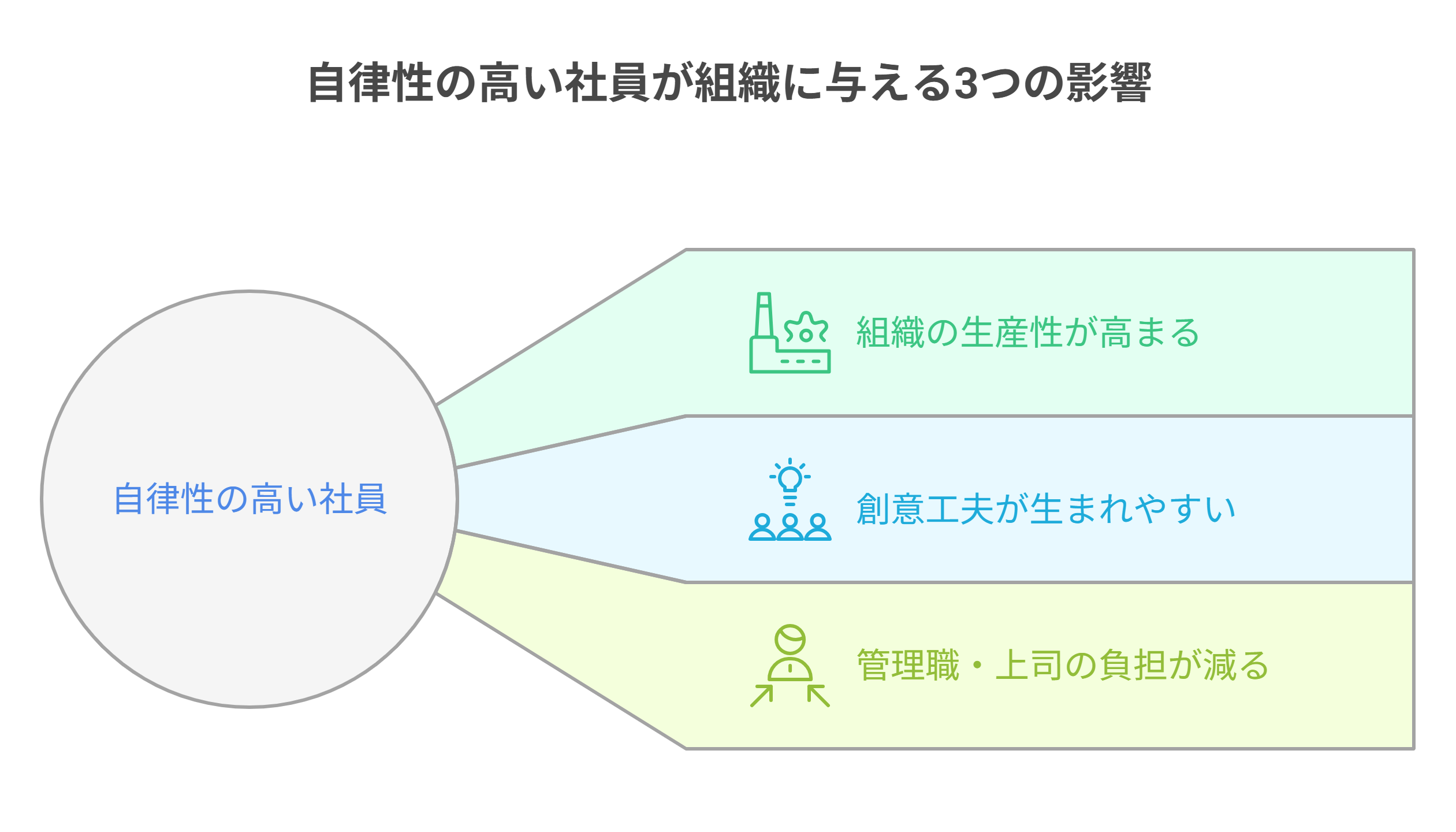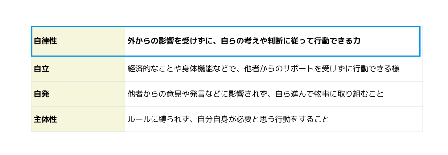 あそぶ社員研修 > お役立ち情報 > 組織・人材開発 > 自律性を高める方法20選!自立・自発・主体性との違い、自律性が求められる理由を解説 自律性を高める方法20選!自立・自発・主体性との違い、自律性が求められる理由を解説 2025.09.01 組織・人材開発 この記事の監修者 友水 一喜 株式会社IKUSA あそぶ社員研修事業部 責任者 変化の激しい現代社会においては、自らの考えや判断をもとに行動できる、自律性の高い社員の存在が、企業のさらなる発展には欠かせません。本記事では、自律性とは何か、社員に自律性が求められる理由、自律性の高い社員が組織に与える影響、自律性を高める方法20選をそれぞれ紹介します。 楽しいからこそ学びは定着する ゲーム形式のアクティビティと振り返り・体系的な学びで明日から実践できる研修 「あそぶ社員研修 資料」を無料で受け取る 目次自律性とは自律性を高める方法20選社員に自律性が求められる理由自律性の高い社員が組織に与える影響まとめ自律性とは自律性とは「自らを律する」と書くように、外からの影響を受けずに、自らの考えや判断に従って行動できる力を意味します。「自律性のある人」というのは、自分で考えた決まりや習慣などから逸れることなく、目標に向かって行動できる人のことを表します。ビジネスシーンでは、上司からの指示を待つのではなく、自らが率先して注力すべきことを考えて判断し、行動できるような人のことをいいます。自立との違い自律と自立はどちらも同じ読み方ですが、言葉の意味は異なります。自立とは、主には経済的なことや身体機能などにおいて、他者からのサポートを受けずに行動できる様を意味します。上述した「自律」は、その人の内面を表すのに対して、自立は外面の様子を表す際に使われます。また、自立には「自らの決まりやルールに従う」という意味は含まれないことが、自律との1つの違いとしてあげられます。自発との違い自発とは、他者からの意見や発言などに影響されず、自ら進んで物事に取り組んだり行動に移したりすることをいいます。自らの判断によって行動を起こすことは「自律」と同義ですが、自発には「自らの決まりやルールに従う」という意味は含まれません。主体性との違い主体性とは、ルールに縛られず、自分自身が必要と思う行動をすることをいいます。決まりやルールなどで自らを律するのではなく、自らができること(自分に必要とされていること)を考えて行動できる人を「主体性のある人」と表現します。自律が「自分の決まりやルールに従う」ことに対して、主体性は決まりやルールに関係なく、自らが必要であると判断したことに取り組むのが、2つの相違点といえます。 楽しさだけで終わらない。楽しいから自発的に参加でき、協働体験が従業員同士の繋がりを強める。感情と学びを結びつけエンゲージメントが向上する研修。「あそぶ社員研修 資料」を無料で受け取る 自律性を高める方法20選社員の自律性を高める方法20選を紹介します。1.自社に必要な人材を定義する自社の求める人材像を明確に定義しましょう。社員へ具体的に示し、それを人事評価にまで含めることで、社員は評価を得るために努力します。企業は経営戦略の1つとして、求める人材の育成に取り組みやすくなります。実施する際のポイント・注意点どのような人物像に成長してほしいのかを明確に定義することで、目標の設定も具体化されて、社員も努力の方向性を理解しやすい。成長過程で社員全員が同じ方向を向くことで、企業文化の醸成にもなる。2.自社の「自律性の高い人」を分析し、具体的な育成目標を立てる組織内の「自律性の高い人」をロールモデルとして見せることは、社員の自律性を育むのに効果的です。ロールモデルを分析し、「なぜ・どこが(どのような状況で)」自律性が高いと判断したのか明確にすることで、具体的な育成目標を立てることが可能になります。近くに目標となる人がいることは、仕事の取り組み方や考え方などをより具体的に理解できます。実施する際のポイント・注意点自社にあった「自律性」を明確にする3.「自律性を高める」ための施策の重要性を社内で共有する社員自身が「自律性を高める重要性」を理解していないと、成長促進にはつながりません。部下を直接指導する上司や管理職以外にも、社員全員が同じ方向を向いて施策を受け入れることが、自律性の高い社員が多い職場づくりに必要です。実施する際の実施する際の実施する際のポイント・注意点トップメッセージや社内ミーティング、定期的な面談などが活用できる。上司や管理職が率先して取り組むことで、部下に対する説得力が増す。4.心理的安全性を確保する心理的安全性が高い環境だと、社員ものびのびと仕事に取り組めます。失敗を恐れず、主体的にチャレンジしていくことが、自律性の向上にもつながります。実施する際のポイント・注意点社内コミュニケーション・相互理解