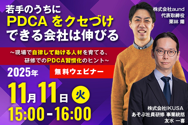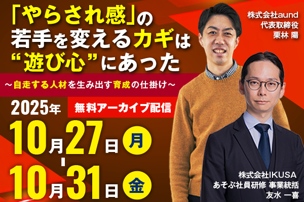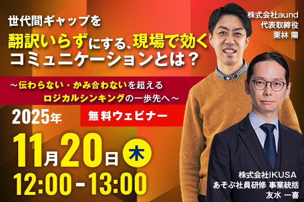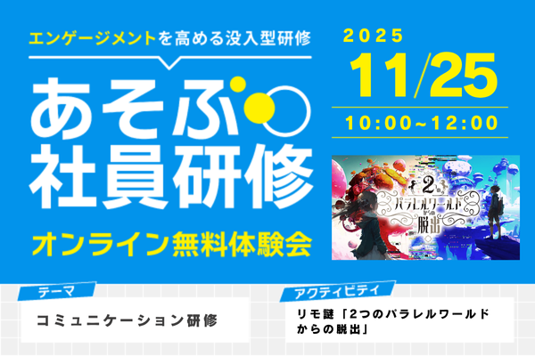 セミナー・体験会一覧 開催予定のセミナー・体験会 【無料体験会】コミュニケーション研修「2つのパラレルワールドからの脱出」 日程 2025.11.25 時間 10:00~12:00 形式 オンライン体験会 世代間ギャップを“翻訳いらず”にする、現場で効くコミュニケーションとは? 日程 2025.11.20 時間 12:00~13:00 形式 オンラインセミナー 開催済みのセミナー・体験会 若手のうちにPDCAをクセづけできる会社は伸びる~現場で“自律して動ける人材”を育てる、研修でのPDCA習慣化のヒント~ 日程 2025.11.11 時間 15:00-16:00 形式 オンラインセミナー ~令和流・人が辞めない職場を作る~採用・育成・定着のトータル人材戦略 日程 2025.10.8 時間 12:00-13:00 形式 オンラインセミナー 「やらされ感」の若手を変えるカギは“遊び心”にあった ~自走する人材を生み出す育成の仕掛け〜 日程 2025.10.31 時間 常時 形式 アーカイブ 【アーカイブ動画】新人研修、その目的は新人に“腹オチ”していますか? ~最初と最後をおさえるだけで、“やらされ感”が“主体性”に変わるその方法とは~ 日程 2025.10.24 時間 常時 形式 アーカイブ 「やらされ感」の若手を変えるカギは“遊び心”にあった ~自走する人材を生み出す育成の仕掛け~ 日程 2025.10.16 時間 12:00-13:00 形式 オンラインセミナー 新人研修、その目的は新人に“腹オチ”していますか? ~最初と最後をおさえるだけで、“やらされ感”が“主体性”に変わるその方法とは~ 日程 2025.10.01 時間 12:00-13:00 形式 オンラインセミナー いまから準備する 候補者のエンゲージメントを高める新卒採用の仕掛け3選 日程 2025.09.05 時間 11:00-12:00 形式 オンラインセミナー あそぶ社員研修「コミュニケーション研修」オンライン体験会 日程 2025.07.30 時間 10:00-12:00 形式 オンライン体験会 【アーカイブ配信】内定辞退リスクを減らす、「この会社で働きたい!」を引き出す体験デザインの極意 日程 2025.07.25 時間 アーカイブ配信 形式 アーカイブ 【無料セミナー】無理なく・楽しく・成果につながる! 〜“ながら”&“遊び”で変わる、新しい人材育成のカタチ〜 日程 2025.07.09 時間 16:00-17:00 形式 オンラインセミナー 12345...>»